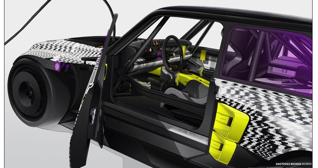 Impossible de ne pas reconnaitre l’allure musclée caractéristique de la Renault 5 Turbo, immortalisée par Jean Ragnotti lors de ses victoires au Monte-Carlo et au Tour de Corse. L’ensemble multiplie les clins d’œil tout en adoptant des éléments résolument modernes, comme les feux longue portée suggérés par des carrés de LED, les multiples écrans pour l’instrumentation de bord qui rappelle la multitude de compteurs à aiguille d’antan, ou encore les larges prises d’air sur les flancs.