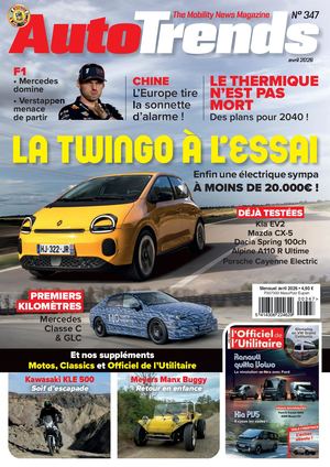N° 347 avril 2026 F1 • Mercedes CHINE LE THERMIQUE domine L’Europe tire N’EST PAS • Verstappen menace la sonnette MORT de partir d’alarme ! Des plans pour 2040 ! LA TWINGO À L’ESSAI Enfin une électrique sympa À MOINS DE 20.000€ ! DÉJÀ TESTÉES Kia EV2 Mazda CX-5 Dacia Spring 100ch Alpine A110 R Ultime Porsche Cayenne Electric Mensuel avril 2026 • 4,90 € PREMIERS P307393 MassPost Eupen KILOMÈTRES Mercedes Classe C & GLC Et nos suppléments Motos, Classics et Officiel de l’Utilitaire Kawasaki KLE 500 Meyers Manx Buggy Soif d’escapade Retour en enfance COVER AT 347.indd 1 30/03/26 16:25