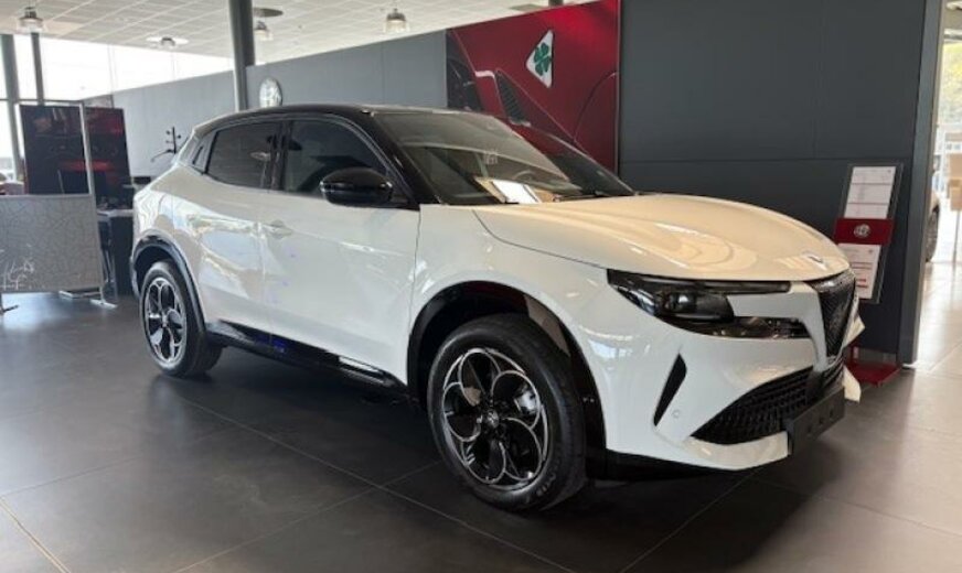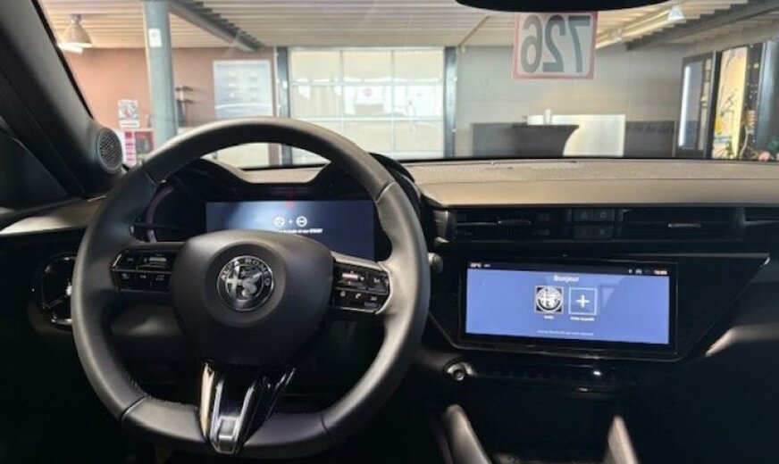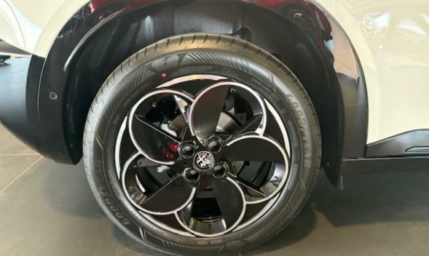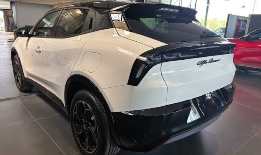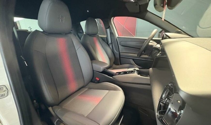 Couleur extérieure: 934 Bianco Sempione con tetto nero\r\nCouleur intérieure: 070 Spiga: rouge/noir tissu/TechnoLeatherConducteur 6x reg. Elec. fonction massage /\r\nPassager 4x reg.\r\n11 kW On-Board-Charger convertisseur du courant alternatif\r\nau courant continu Accoudoir central avant\r\nAlfa Connect Services Alfa Connect Services - box\r\nAppuie-tête pour sièges arrière BEV interior vibe sound\r\nCannocchiale - Tableau de bord numérique 10,25\\\" Capteur de pluie\r\nCapteurs de stationnement arrière Chargement rapide en CC jusqu\\\'à 100 kW\r\nClimatisation Automatique Dossier du siège avant avec poches\r\nDossier rabattable des sièges arrière 60/40 E-call\r\nEtriers de freins Feux arrière LED\r\nFrein de stationnement électrique Avec maintien\r\nautomatique \r\nIcona: Tissu bleu/noir Conducteur 6x reg. manuel / Passager\r\n4x reg. manuel\r\nJantes en alliage 18\\\" - Petali KeylessGo\r\nMode 3 Câble de recharge Triphasé Pack guide rapide en français\r\nPhares Led Pompe à chaleur\r\nReconnaissance des usagers de la route vulnérables VRU -\r\nPiéton + Cycliste Régulateur De Vitesse Adaptatif ACC \r\nRétroviseur intérieur à gradation manuelle Rétroviseurs extérieurs à commande électrique\r\nScudetto Leggenda Système audio avec 4 haut-parleurs\r\nSélecteur De Mode \\\"DNA\\\" Transport Cover\r\nVitres à commande électrique Volant en \\\"TechnoLeather\\\"\r\nÉcran radio tactile 10,25\\\" Apple Carplay/AndroidAuto\r\nKit de gonflage pour pneumatiques Lampes de lecture LED à l\\\'avant et à l\\\'arrière avec fonction\r\ntactile\r\nPack Guide rapide en allemand Pack Tech Lite\r\nPare-brise chauffant uniquement la zone de reposdes\r\nessuie-glaces Toit ouvrant panoramique\r\ntoit noir