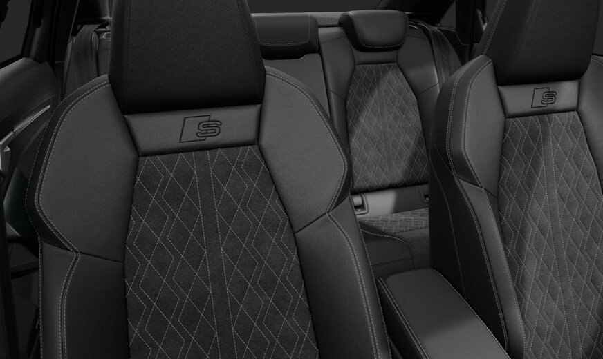 Het afgeplatte, met leder beklede sportstuur met schakelpeddels en de verduisterde ruiten versterken de dynamische uitstraling.