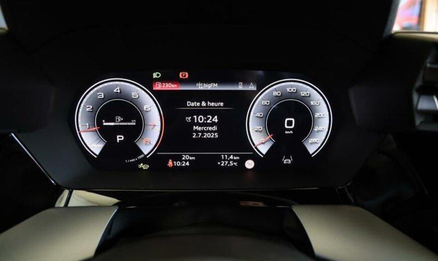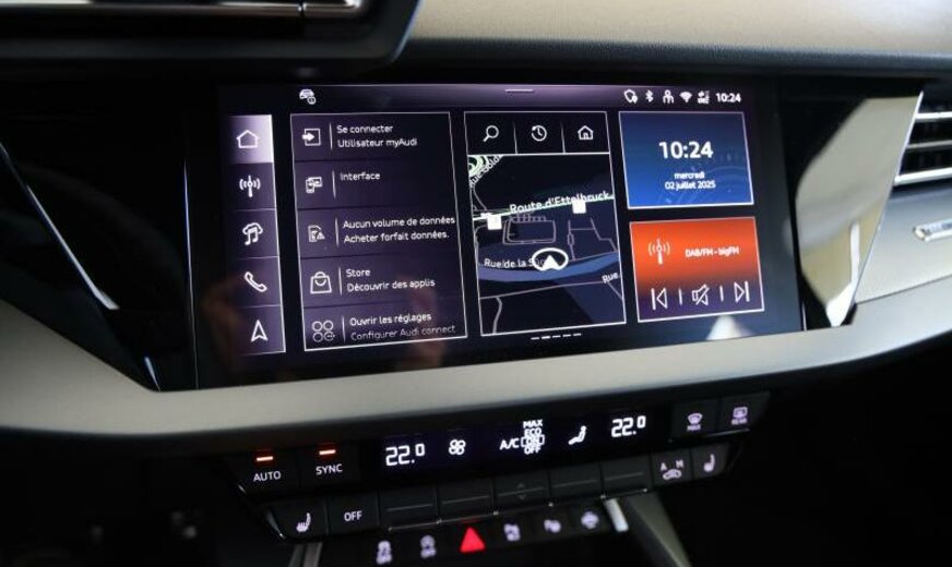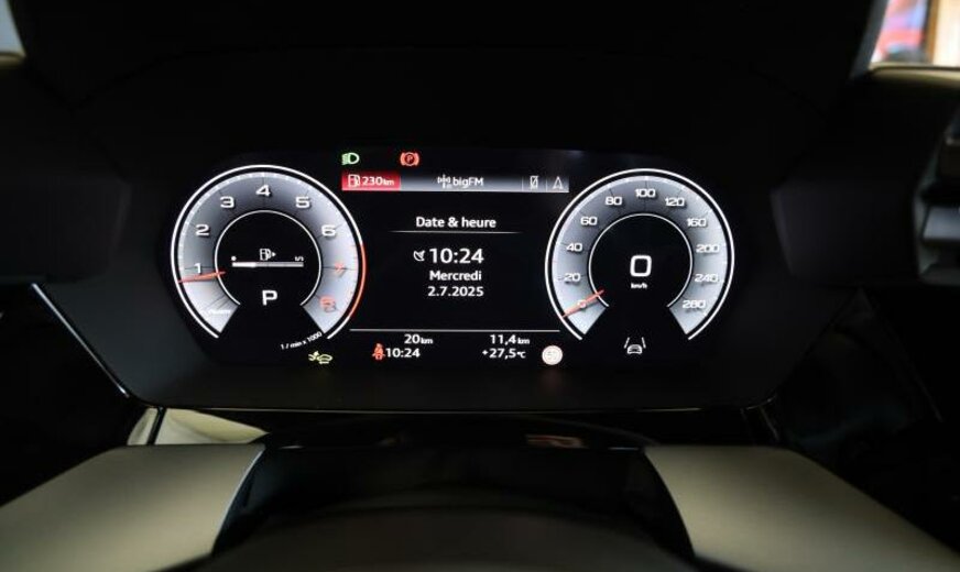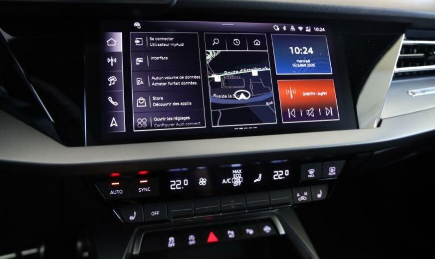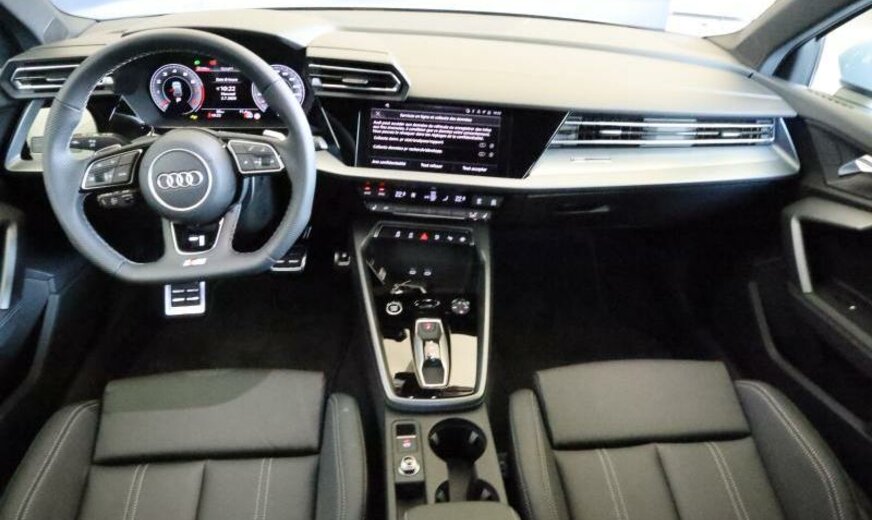 Front Assist avec freinage d\\'urgence City, liquide de refroidissement R1234yf, assistant à la conduite, pare-brise avec bande de couleur, radio avec récepteur numérique, rétroviseur g avec miroir asphérique, garnissage cuir/simili-cuir avec logo S en relief, garniture pavillon noir, monogramme S-line au volant, appuis lombaires av réglables électrique, dossiers ar séparés en 3 parties avec accoudoir central, 1498 cc 1,5 L 110 KW, 7 J x 16 Alu, système de gonflage des pneus, Audi Phone Box, encarts décoratifs aluminium noir \\Spektrum\\, look aluminium, suspension ar à 4 bras, transmission hybride M-HEV, réservoir à charbon actif EVAP , modèle 2024 Facelift , freins av 288x15, pédalier Sport, 2 couches nacrée