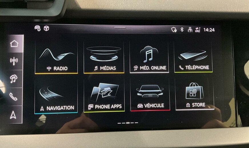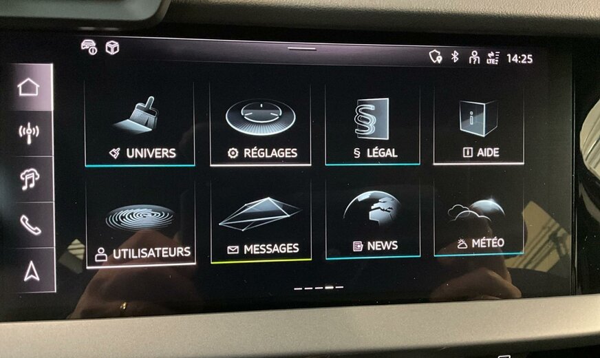 2D2DBleu navarra métallisé\r\nAOnoir-noir-gris roche/noir-noir /noir/gris acier\r\nPWAIntérieur avec sièges normaux, combinaison cuir/simili cuir noir\r\nPYCPack de climatisation plus\r\nPYKPack d\\'assistance à la conduite et au stationnement plus\r\nWKEPack Business plus\r\n41RRoues, style 5 branches, 8,0J x 17, pneus 225/45 R17\r\n4G3Assistance aux embardées et assistance aux virages\r\n4GHVitrage calorifuge et acoustique pour pare-brise avec bande teintée Gris\r\n4UFAirbags frontaux, airbag passager avant désactivable\r\n4VNNorme d\\'émission, WLTP3 M1, N1-I//EU6EB\r\n6C2Airbags latéraux à l\\'avant avec système d\\'airbags rideaux et airbag central à l\\'avant\r\n6I5Avertissement de sortie de voie avec assistance d\\'urgence\r\n7K1Système de surveillance de la pression des pneus\r\n7UGMMI Navigation plus avec MMI touch\r\n8J3Audi pre sense avant\r\n98RPack Infodivertissement 1 uniquement pour Audi \r\n9S9Cockpit virtuel Audi Plus\r\n9VDSystème audio Audi\r\n9ZVAudi phone box light\r\nB32Pays d\\'homologation Luxembourg\r\nIT3Audi connect Navigation et Infodivertissement Plus\r\nIU4Boutique d\\'applications Audi et interface pour smartphone\r\nIW3Appel d\\'urgence et service Audi connect avec télécommande et contrôle Audi connect\r\nJE3Module de données pour l\\'Europe\r\nNZ2Appel d\\'urgence juridique\r\nQK1Avec caméra multifonction\r\nQR9Reconnaissance des panneaux de signalisation par caméra\r\nQV3Diffusion audio numérique\r\n3A5Ancrages pour siège enfant ISOFIX à l\\'avant, top tether et i-Size pour les sièges extérieurs arrière\r\n4H5Sécurité enfants à commande électrique\r\n5MJInsert décoratif en Aluminium Foncé \\Spektrum\\\r\n7X5Aide au stationnement avec aide au stationnement Plus\r\n8T3Régulateur de vitesse adaptatif sans limiteur de vitesse\r\nQL5Verre réfléchissant la chaleur teinté foncé