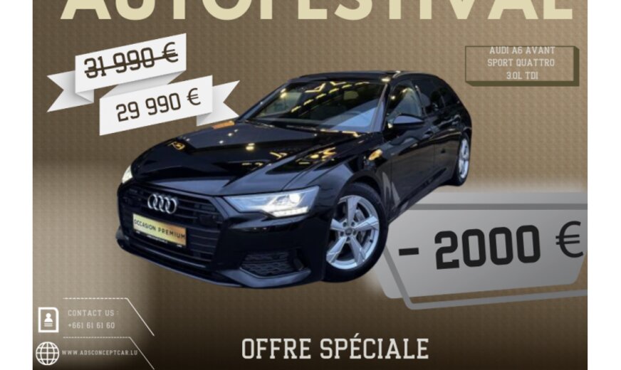BIENVENUE CHEZ ADS CONCEPT CAR\r\n\r\nINFORMATIONS GÉNÉRALES\r\nMarque: AUDI \r\nModèle: A6\r\nType: AVANT SPORT QUATTRO 3.0 231 CH\r\nForme de carrosserie: Break\r\nAnnée du modèle: 2019\r\n\r\nGARANTIE \r\nADS CONCEPT CAR\r\n12 mois\r\n\r\nRETROUVER CE VÉHICULE SUR NOTRE PARC A FOETZ:\r\n4 Rue de l\\'Avenir L-3895 foetz \r\nLuxembourg\r\n\r\n\r\nNous proposons également des SOLUTIONS DE FINANCEMENT sur place, étudiées et adaptées à votre situation, afin de faciliter l\\'acquisition de votre futur voiture\r\n\r\nProfitez d’une estimation de reprise sur mesure, sans engagement, et réservez un essai personnalisé du véhicule d’occasion qui retient votre attention.\r\nNos conseillers se tiennent à votre disposition — en ligne, par téléphone ou en showroom — pour vous accompagner à chaque étape.\r\n\r\nLes équipements indiqués ont été recensés avec attention. Cependant, certains éléments peuvent varier ou ne pas apparaître dans cette descrlption.\r\nNous vous recommandons donc de vérifier les équipements qui comptent le plus pour vous avant de confirmer votre achat.\r\nCette présentation est fournie à titre informatif.\r\n\r\n\r\nLISTES DES OPTIONS :\r\n Aide au stationnement avant\r\n Aide au stationnement arrière\r\n Climatisation\r\n Climatisation automatique\r\n Caméra de recul\r\n Crochet de remorquage\r\n direction assistée\r\n Jantes en alliage\r\n Ordinateur de bord\r\n Phares antibrouillards\r\n Régulateur de vitesse\r\n Régulateur de vitesse/distance\r\n Rétroviseurs électriques\r\n Sièges avant chauffants\r\n Système de navigation GPS \r\n Toit ouvrant\r\n Toit panoramique\r\n Senseurs pluie\r\n Senseurs lumière\r\n Bluetooth\r\n Pack Sport\r\n Phares LED\r\n Phares directionnels\r\n Commande vocale\r\n Park Assist\r\n Hayon arrière électrique\r\n Volant chauffant\r\n Radio numérique\r\n Ecran tactile\r\n Verrouillage centralisé sans clé\r\n USB\r\n Alerte de franchissement involontaire de lignes\r\n Phares de jour LED\r\n Accoudoir\r\n Suspension pneumatique\r\n Phares de jour\r\n Apple CarPlay\r\n Siège à réglage lombaire\r\n Volant en cuir\r\n Rétroviseur intérieur anti-éblouissement autom.\r\n Android Auto\r\n Isofix\r\n Dispositif mains libres\r\n Système de détection de la somnolence\r\n Système d\\'appel d\\'urgence\r\n Système de contrôle de la pression pneus\r\n Palettes de changement de vitesses\r\n Verrouillage centralisé\r\n Assistant feux de route\r\n Airbag conducteur\r\n Éclairage d\\'ambiance\r\n Cockpit digital\r\n Frein de stationnement électronique\r\n Airbag passager\r\n Airbags latéraux\r\n ESP\r\n Vitres teintées\r\n SOUS RÉSERVE D\\'ERREURS \r\n\r\nN\\'hésitez pas à nous contacter pour toute question sur nos véhicules :\r\n\r\n+352 661 61 61 60 \r\n+352 621 484 350\r\n www.adsconceptcar.lu\r\n\r\nADS CONCEPT CAR