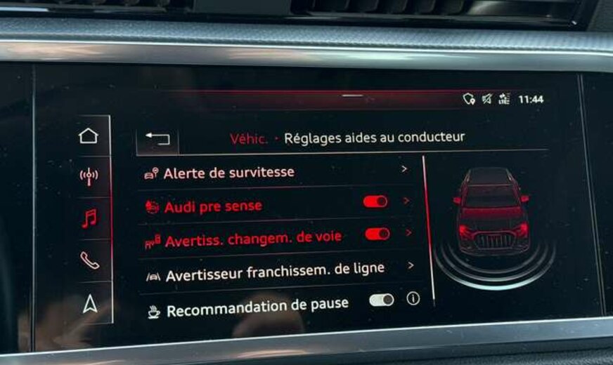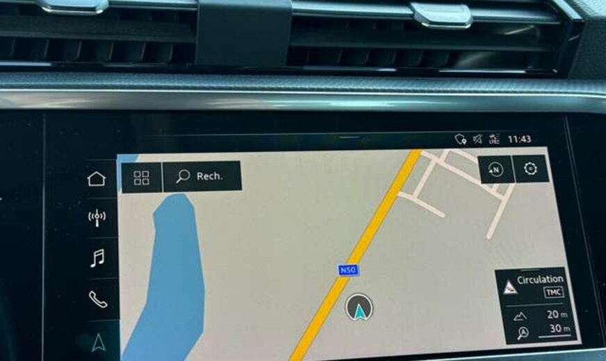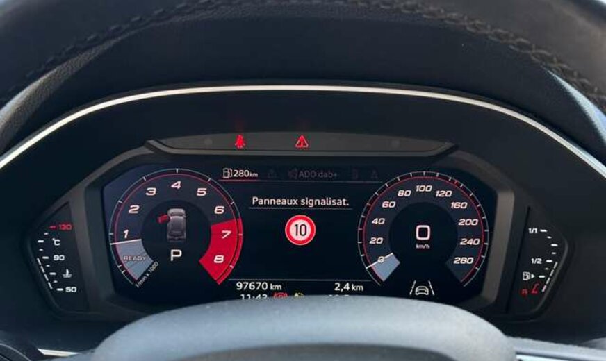 Ce Q3 bénéficie d'une garantie constructeur de 12 mois et dispose d'un historique sans sinistre. Les systèmes d'aide à la conduite incluent caméra de stationnement, alerte de franchissement de ligne, avertisseur d'angle mort et détection des panneaux routiers, garantissant sécurité et sérénité. Le volant multifonctions en cuir et le rétroviseur intérieur anti-éblouissement complètent cette dotation.