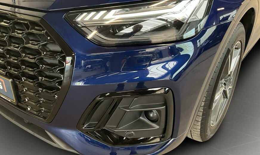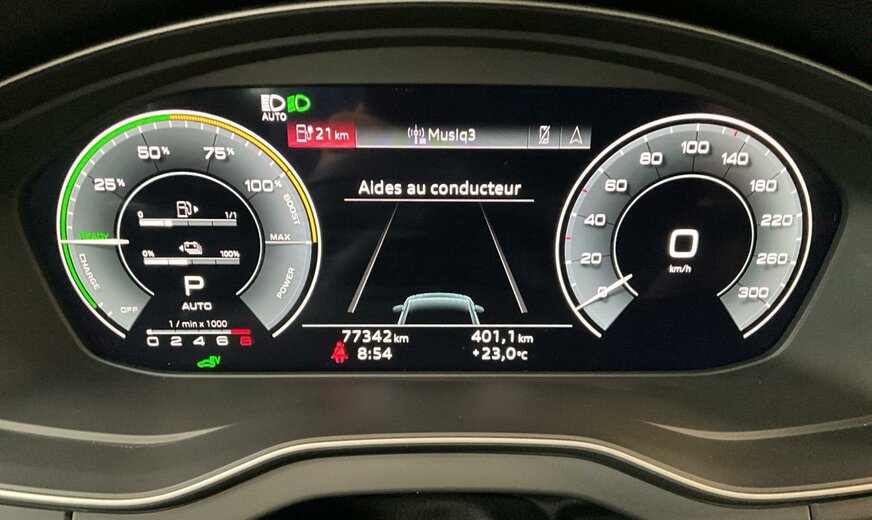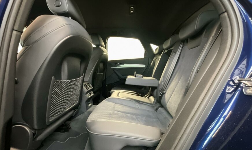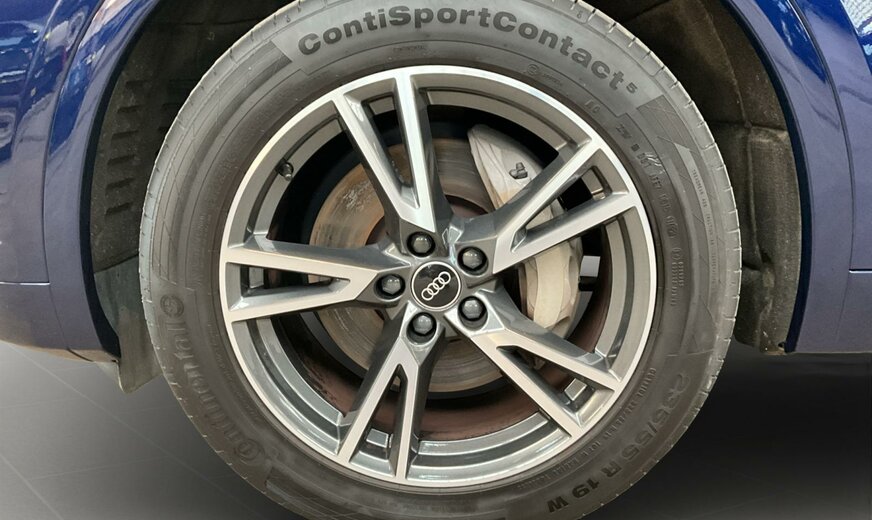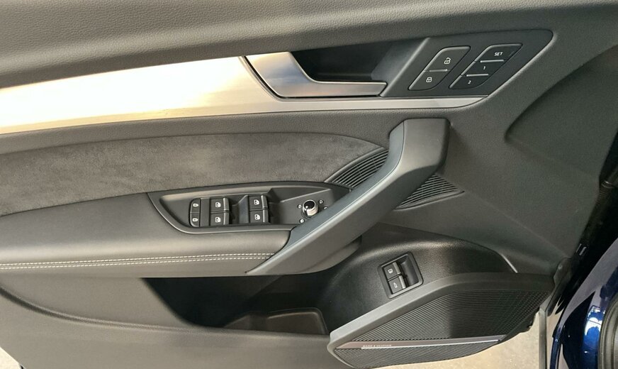 2D2D Bleu Navarre Métallisé \r\nEI Noir-Noir-Gris Roche/Noir-Noir/Noir/Noir \r\nPCM Pack Assistance en ville \r\nPCN Pack Assistance Tour \r\nPGD Clé confort avec déverrouillage du coffre commandé par capteur y compris alarme antivol \r\nPIH Pack Sécurité enfants \r\nPV3 Sièges avant à réglage électrique avec fonction mémoire pour le siège du conducteur et les rétro. extérieurs \r\nPXC Projecteurs Matrix LED et blocs de feux arrière à LED et lave-projecteurs \r\nWLQ Pack Premium \r\nWQS Intérieur S line \r\n0VB Documentation de bord en français \r\n1BK adaptive air suspension \r\n3S0 Sans barres de toit \r\n40S Jantes en alliage léger, en style 5 branches en V, Gris Graphite, tournées brillantes, 8,0J x 19, pneus 235/55 R19 \r\n4A3 Chauffage de siège à l\\\'avant \r\n4ZD Pack Style Noir \r\n5TG Inserts décoratifs en aluminium Mat Brossé \r\n7HB Éléments d\\\'équipement intérieur en similicuir \r\n9S8 Audi virtual cockpit \r\n9VS Bang Olufsen Premium Sound System avec son 3D \r\nC39 Autorisation de circulation, supplément \r\nGA2 Climatisation stationnaire confort \r\nIT3 Audi connect Navigation Infotainment \r\nIU1 Audi smartphone interface \r\nKS1 Affichage tête haute \r\nN5K Combinaison microfibre Dinamica Fréquence/cuir avec estampage S \r\nQQ2 Pack Éclairage d\\\'ambiance Plus \r\nUH2 Hold assist \r\nVW5 Vitrage acoustique pour les glaces de portes avant
