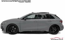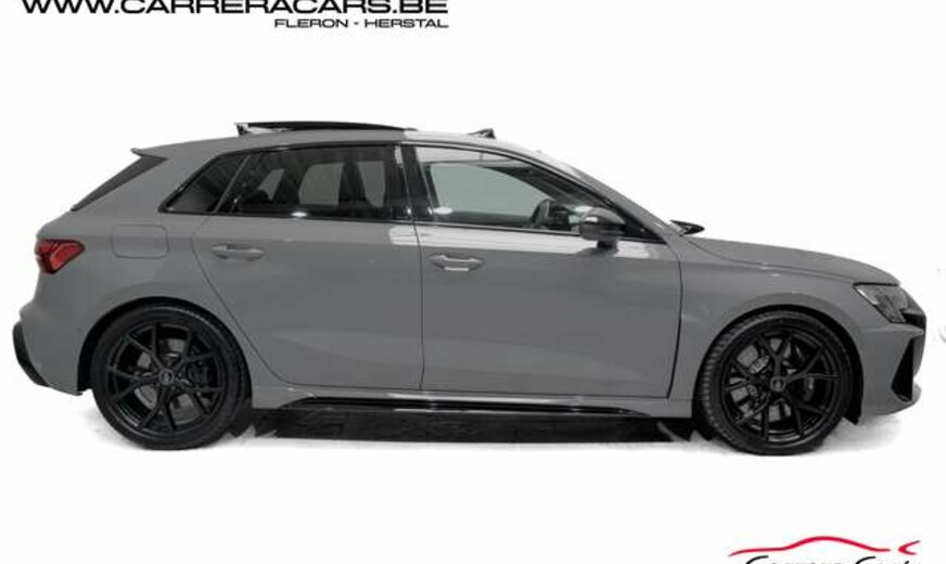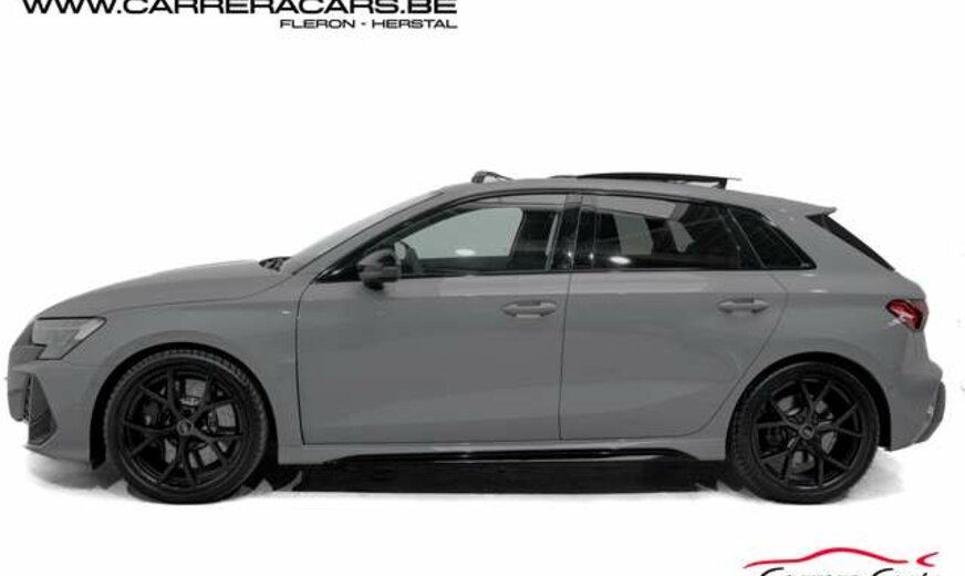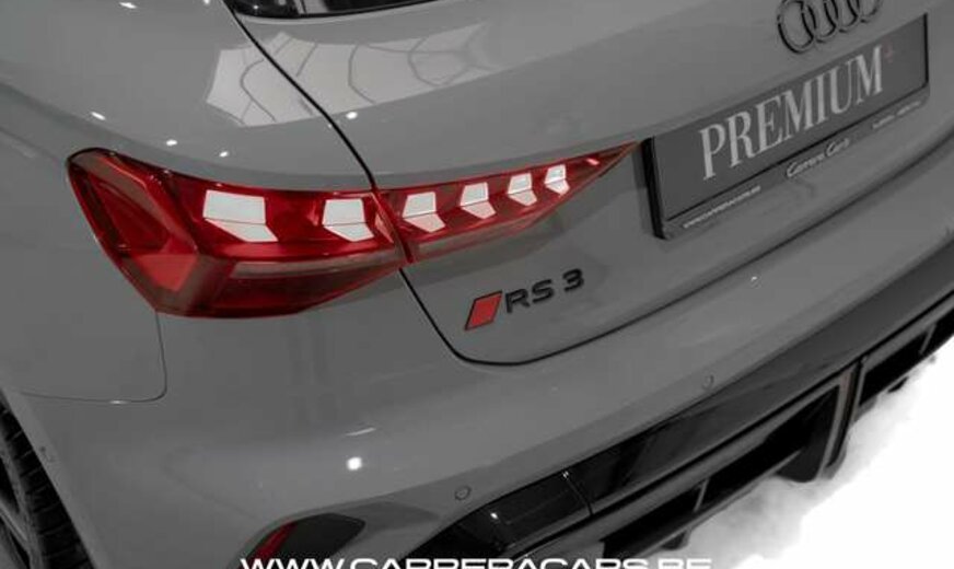 * Equipements : Quattro, Sièges RS baquet sport chauffants carbon et surpiqûre vert, réglages électriques + lombaires, Volant RS multifonctions, Toit ouvrant panoramique, Éclairage d’ambiance LED, Ceintures RS vert, Climatisation automatique 3 zones, Vitres arrière surteintées, Audi Virtual Cockpit Plus (affichage RS), MMI Navigation Plus avec écran tactile, Système audio Sonos, Audi Smartphone Interface, Chargeur à induction + USB-C, Régulateur de vitesse adaptatif, Caméra de recul + radars AV/AR, Feux Matrix LED adaptatifs, Alerte de franchissement de ligne, Détecteurs d’angle mort + trafic arrière, Assistance au stationnement avec affichage dynamique, Pack extérieur noir + diffuseur RS, Calandre nid d’abeille noir RS, Freins RS avec étriers noir, Audi Drive Select, Hayon electrique,