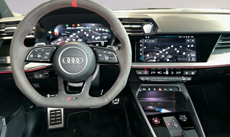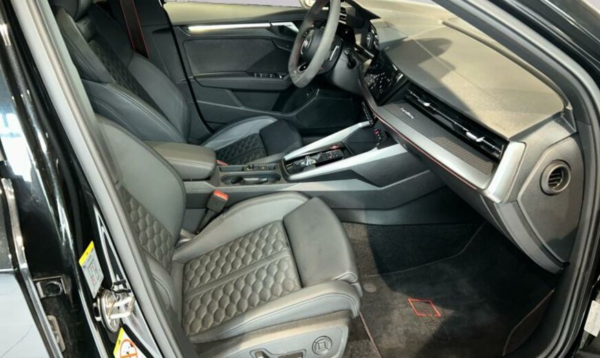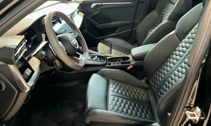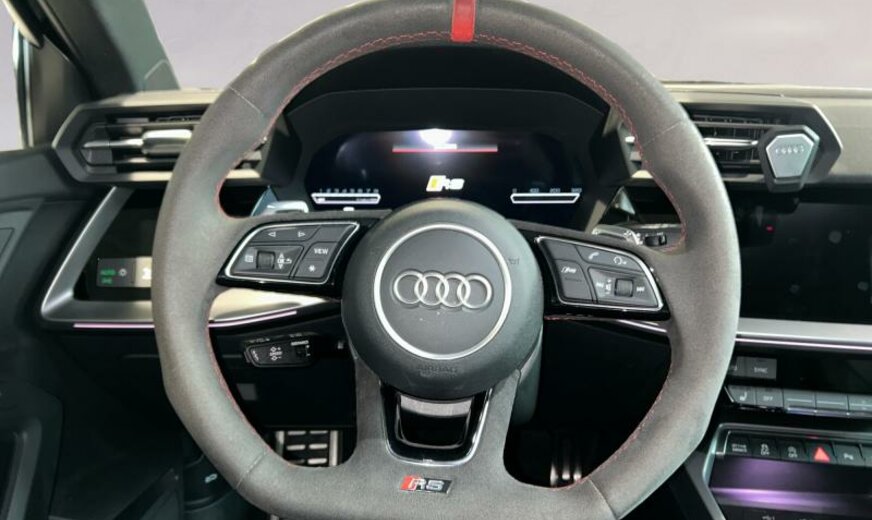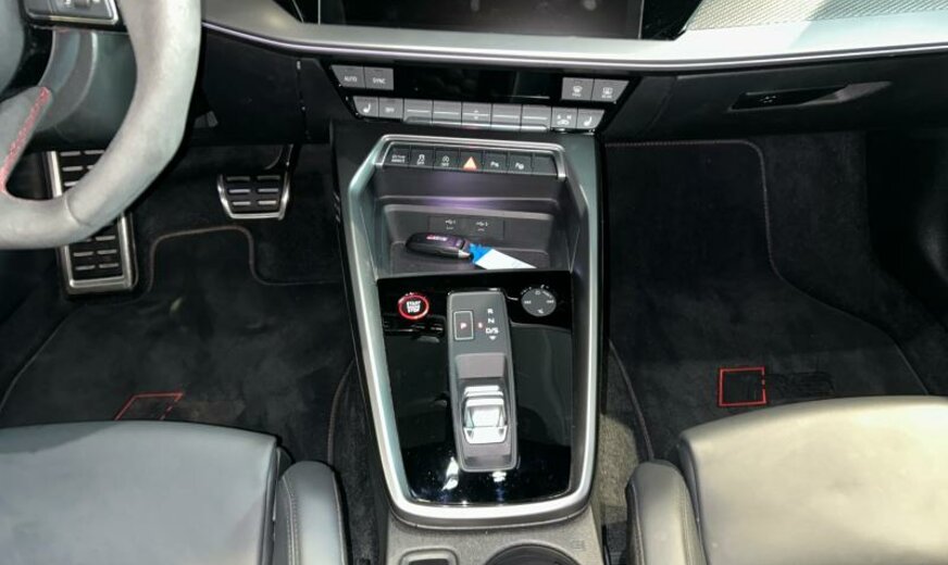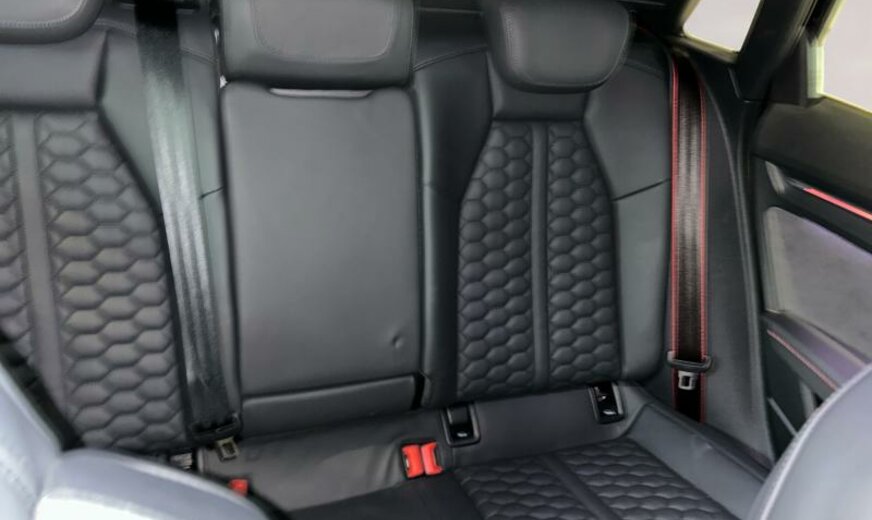 Front Assist avec freinage d\\'urgence City, sécurité enfants électrique, pack optique noir avec monogramme noir, liquide de refroidissement R1234yf, assistant à la conduite, radio avec récepteur numérique, rétroviseur g avec miroir asphérique, ouverture et fermeture confort du hayon, système lave-phares, garniture pavillon noir, pack vide-poches, fixation siège enfant, appuis lombaires av réglables électrique, dossiers ar séparés en 3 parties avec accoudoir central, échappement Sport RS, 2480 CC 294 KW, suspension électronique DCC, avant 9 J x 19 Alu / arrière 8 J x 19 Alu, système de gonflage des pneus, Audi Phone Box, batterie de démarrage ar, encarts décoratifs en carbone, barre stabilisatrice av 24 mm, look aluminium, suspension ar à 4 bras, becquet pavillon S, réservoir à charbon actif EVAP , spoiler av noir brillant seulement pour RS , freins av 374x36, pédalier Sport