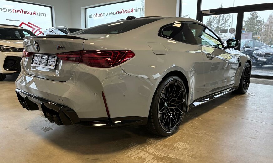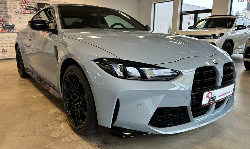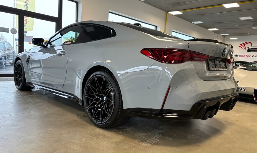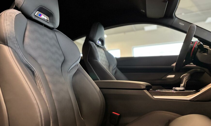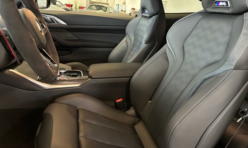 BMW M4 Sonderausstattung: Innenausstattung: Interieurleisten Carbon, Innovations-Paket (2), Lenkrad (M Sport, Alcantara), LM-Felgen vorn/hinten, Metallic-Lackierung M Brooklyn Grau, Parkassistent-Paket Plus, Scheinwerfer BMW Individual Shadow-Line, Sitzbezug / Polsterung: Voll-Leder Merino, Bicolor Weitere Ausstattung: Ablage-Paket, Adaptives Fahrwerk M-Technic, Airbag Beifahrerseite abschaltbar, Airbag Fahrer-/Beifahrerseite, Aktives M Differential, Ambiente-Beleuchtung, Ausstattungs-Paket: Connected Professional, AuÃenausstattung: Shadow-Line Hochglanz, AuÃenausstattung: Shadow-Line Hochglanz (erweiterter Umfang), AuÃenspiegel elektr. verstellbar, AuÃenspiegel heizbar, Bedienelemente galvanisiert, BMW Live Cockpit Professional, Bordcomputer, Dachhimmel Anthrazit, Diebstahlsicherung für Räder (Felgenschlösser), Durchladeeinrichtung (Mittelarmlehne hinten), Dynamische Stabilitäts-Control (DSC) mit erweiterter Umfang, Einstiegsleisten mit Einleger in Aluminium mit Schriftzug M, Fahrassistenz-System: Active Guard (Bremsassistent), Getriebe Automatik - mit Steptronic und Drivelogic (8-Stufen), Getränkehalter, Heckleuchten LED, Induktionsladeschale für Smartphone (Wireless Charging), Innenspiegel mit Abblendautomatik, Isofix-Aufnahmen für Kindersitz an Rücksitz, Karosserie: 2-türig, Kennzeichenbeleuchtung LED, Klimaautomatik 2-Zonen mit autom. Umluft-Control, Kopf-Airbag-System hinten, Kopf-Airbag-System vorn, Leichtbaudach (kohlefaserverstärkter Kunststoff, CFK), Lendenwirbelstütze Sitz vorn links und rechts, elektr. verstellbar, Lenksäule (Lenkrad) mechan. verstellbar, Leuchtweitenregelung, M Drive (Fahrprofilauswahl), M Drive Professional (Fahrprofilauswahl), Modellpflege, Motor 3,0 Ltr. - 390 kW 24V, Personalisierungssystem (BMW ID), Personalisierungssystem (BMW iDrive), Personalisierungssystem (Personal eSIM), Radioempfang digital (DAB+), Reifen-Reparaturset (Mobility-Pack), Reifendruck-Kontrollsystem, Reifenpannen-Anzeige, Schadstoffarm nach Abgasnorm Euro 6e, Schaltpunktanzeige, Seitenairbag vorn, Service-System: ConnectedDrive Services, Sicherheitsgurte M, Sitze vorn elektr. verstellbar (links mit Memory), Sitzheizung vorn, Sonnenschutzverglasung (hinten abgedunkelt), Sound-System Harman-Kardon, Spiegel-Paket, Sportdifferential, Sportsitze vorn (M-Technic), Steckdose (12V-AnschluÃ) in Mittelkonsole vorn, Wärme-/Sonnenschutzverglasung
