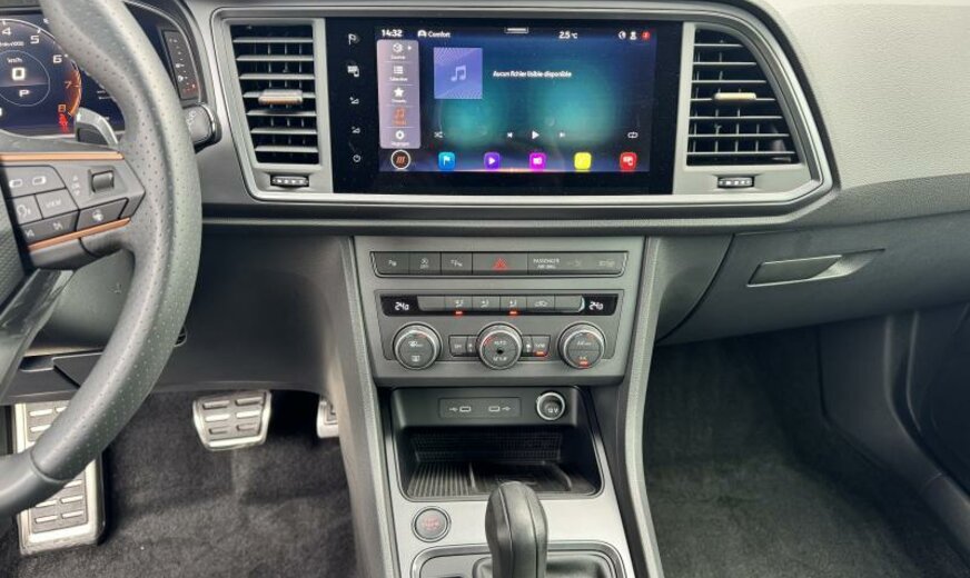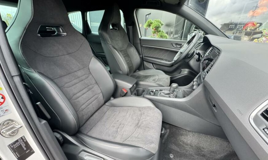 allumage des phares automatique/Coming Home, système d\\'entrée et de démarrage sans clé, protection sous mécanique, 8 haut-parleurs, téléphonie confort, enjoliveurs bas de caisse éclairés, prares cpl LED, réglage hauteur phares automatique, sièges av réglables en hauteur, éclairage périphérique, pédales en aluminium, lampe de lecture av/ar, pare-soleil éclairé, Active Info Display, boîtiers des rétroviseurs et poignées des portes dans la couleur du véhicule, freinage d\\'urgence City, alternateur 140 A, becquet ar, pare-chocs Sport Cupra, 1984 cc 2,0 L 221 KW, liquide de refroidissement R1234YF, réservoir à charbon actif EVAP , 7 vitesses DSG, AWD, JANTES 8 J X 19 ALU, système de gonflage des pneus, boulons de roue avec antivol, train ar \\Multi-Link\\, régulation adaptative de la suspension DCC avec régulation de l\\'amortissement, freins à disque av 340x30, prétensionneurs à l\\'arrière, airbag pour les genoux, galerie de pavillon noire, garnissage des portes en Alcantara, enjoliveurs cadre vitre noir brillant, élargisseurs d\\'aile peints, entretien à intervalle flexible Long Life QI6