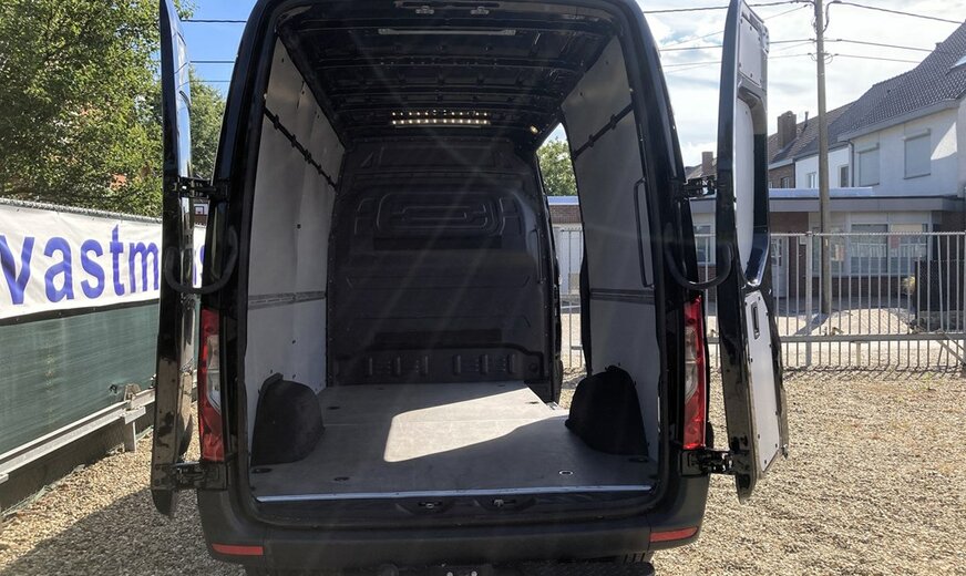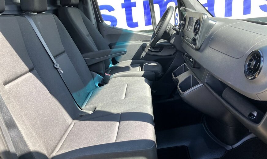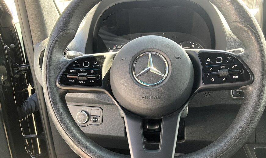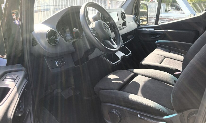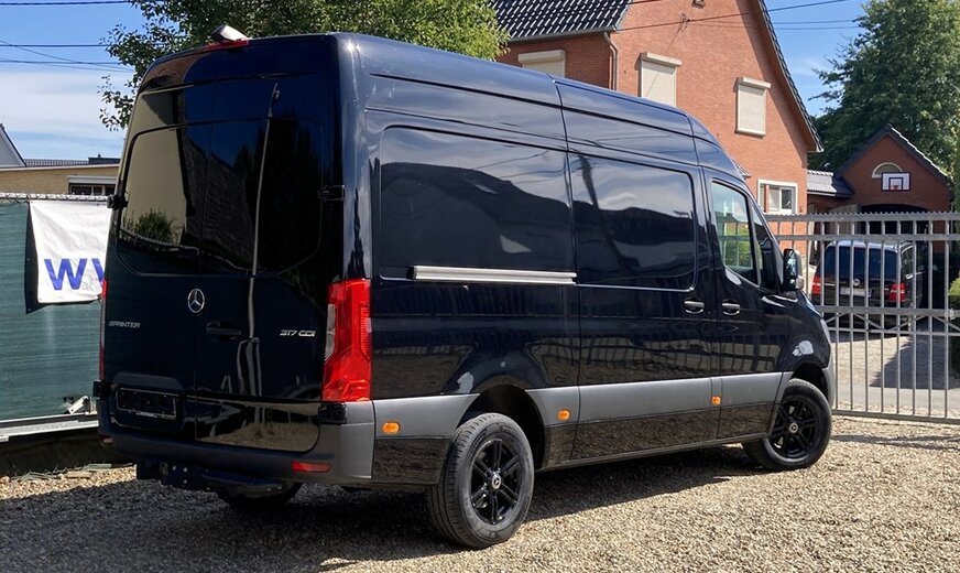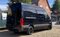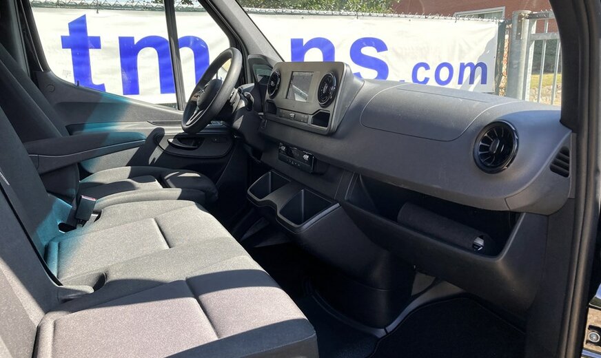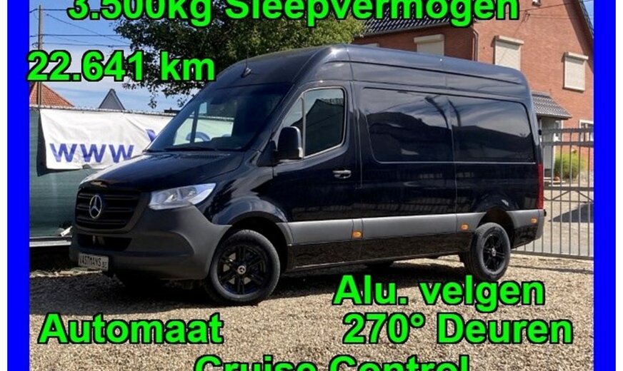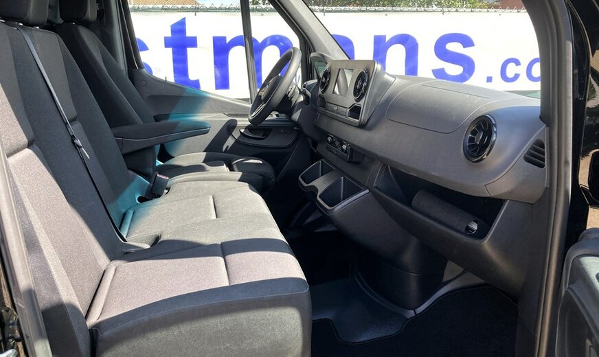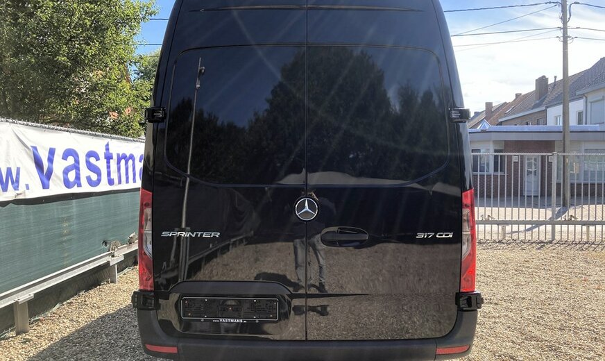 SStijlvolle Mercedes Sprinter 317 ( 170 pk ) van 23/10/2023 met slechts 22.641km in het diepzwart met alu. velgen inclusief 3 zitplaatsen. Mercedes-Benz Motor met distributieketting en de bijhorende achterwielaandrijving. L2H2 / L2 H2 uitvoering