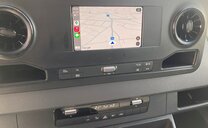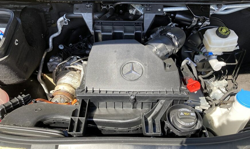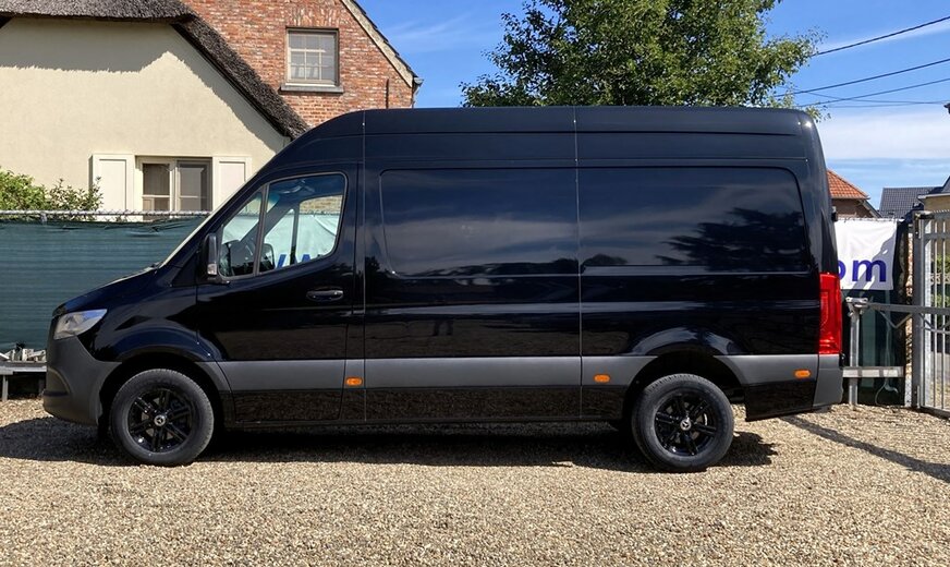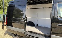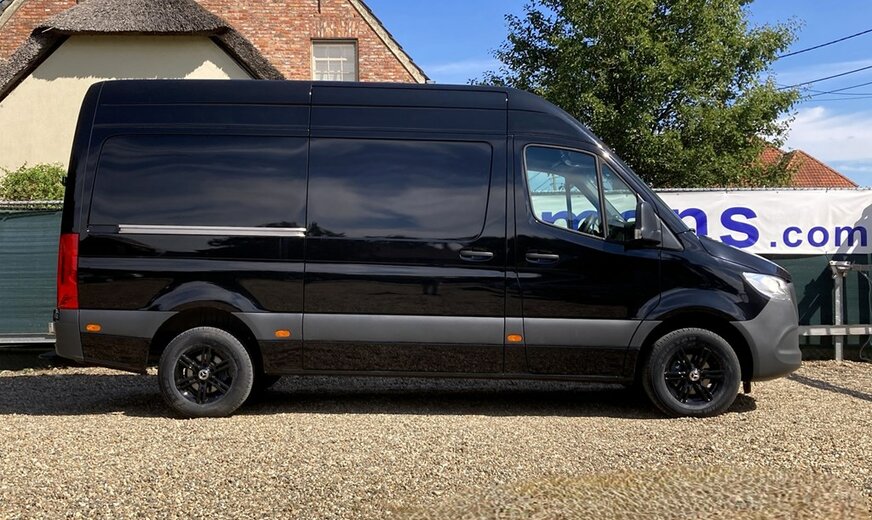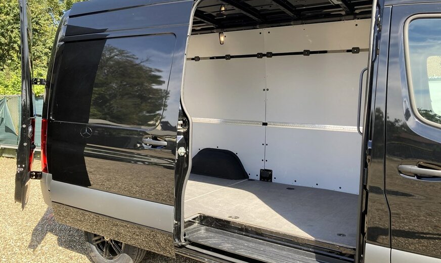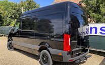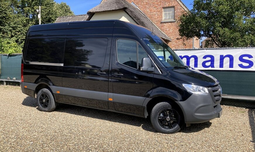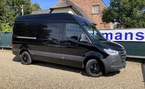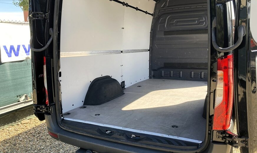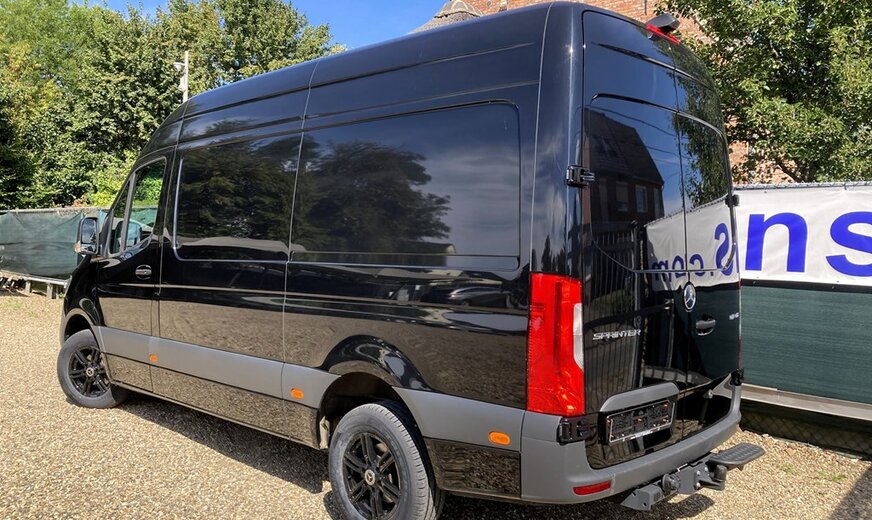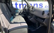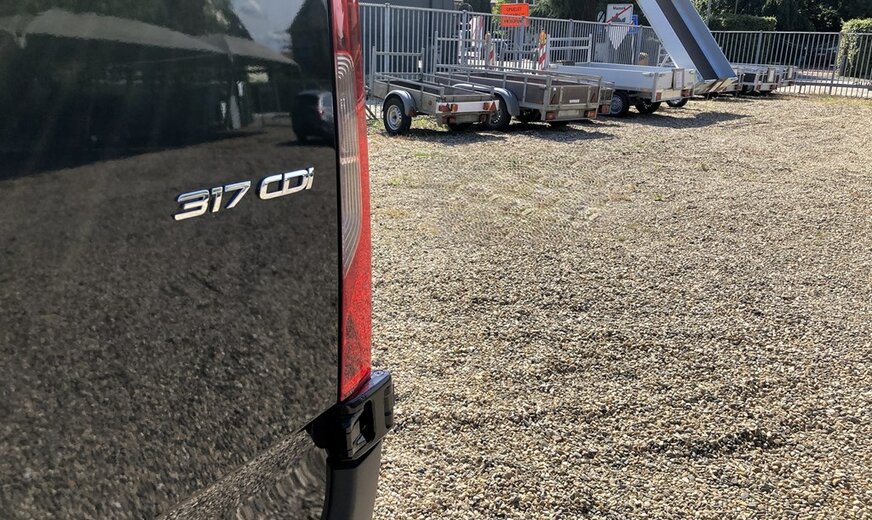 SStijlvolle Mercedes Sprinter 317 ( 170 pk ) van 23/10/2023 met slechts 22.641km in het diepzwart met alu. velgen inclusief 3 zitplaatsen. Mercedes-Benz Motor met distributieketting en de bijhorende achterwielaandrijving. L2H2 / L2 H2 uitvoering