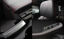 • Polsterung: W0 Lederpaket schwarz mit Kontrastnähten in Papaya (Oberseite Armaturentafel, Deckel Ablagefach in der Mittelkonsole, Sitzmittelbahnen sowie Sitzwangen innen und Kopfstützen-Vorderseite der Sitze, Armauflagen Türverkleidungen und Türzuziehgriffe vorn & hinten in Leder Schwarz)