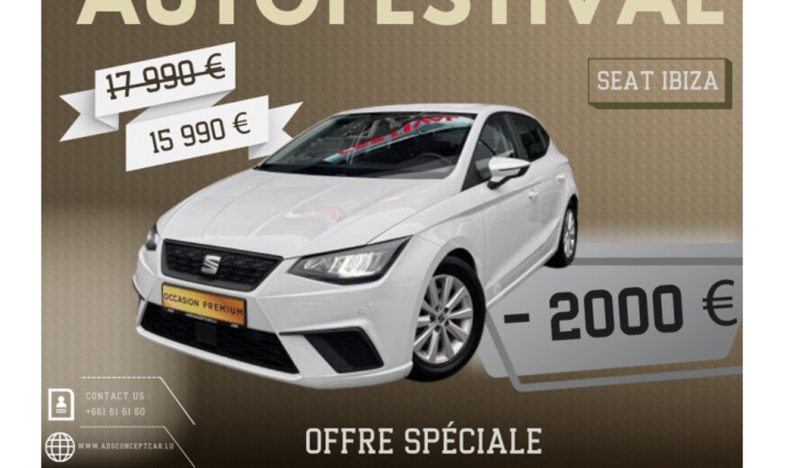 BIENVENUE CHEZ ADS CONCEPT CAR\r\n\r\nINFORMATIONS GÉNÉRALES\r\nMarque: Seat \r\nModèle: IBIZA \r\nType: 1.0L 110CV\r\nForme de carrosserie: Hatch\r\nAnnée du modèle: 2023\r\n\r\nGARANTIE \r\nADS CONCEPT CAR\r\n12 mois\r\n\r\nRETROUVER CE VÉHICULE SUR NOTRE PARC A FOETZ:\r\n4 Rue de l'Avenir L-3895 foetz \r\nLuxembourg\r\n\r\n\r\nNous proposons également des SOLUTIONS DE FINANCEMENT sur place, étudiées et adaptées à votre situation, afin de faciliter l'acquisition de votre futur voiture\r\n\r\nProfitez d’une estimation de reprise sur mesure, sans engagement, et réservez un essai personnalisé du véhicule d’occasion qui retient votre attention.\r\nNos conseillers se tiennent à votre disposition — en ligne, par téléphone ou en showroom — pour vous accompagner à chaque étape.\r\n\r\nLes équipements indiqués ont été recensés avec attention. Cependant, certains éléments peuvent varier ou ne pas apparaître dans cette descrlption.\r\nNous vous recommandons donc de vérifier les équipements qui comptent le plus pour vous avant de confirmer votre achat.\r\nCette présentation est fournie à titre informatif.\r\n\r\n\r\nLISTES DES OPTIONS :\r\n Aide au stationnement avant\r\n Aide au stationnement arrière\r\n Climatisation\r\n Alarme\r\n Caméra de recul\r\n direction assistée\r\n Phares antibrouillards\r\n Régulateur de vitesse\r\n Régulateur de vitesse/distance\r\n Système de navigation GPS \r\n Senseurs pluie\r\n Senseurs lumière\r\n Bluetooth\r\n Phares LED\r\n Phares directionnels\r\n Commande vocale\r\n Park Assist\r\n Radio numérique\r\n Volant multifonctions\r\n Assistant de démarrage en côte\r\n Ecran tactile\r\n USB\r\n Alerte de franchissement involontaire de lignes\r\n Phares de jour LED\r\n Accoudoir\r\n Phares de jour\r\n Start/Stop automatique\r\n Apple CarPlay\r\n Détection des panneaux routiers\r\n Volant en cuir\r\n Rétroviseur intérieur anti-éblouissement autom.\r\n Android Auto\r\n Isofix\r\n Système d'appel d'urgence\r\n Système de contrôle de la pression pneus\r\n Verrouillage centralisé\r\n Airbag conducteur\r\n Cockpit digital\r\n Airbag passager\r\n ESP\r\n SOUS RÉSERVE D'ERREURS \r\n\r\nN'hésitez pas à nous contacter pour toute question sur nos véhicules :\r\n\r\n+352 661 61 61 60 \r\n+352 621 484 350\r\n www.adsconceptcar.lu\r\n\r\nADS CONCEPT CAR