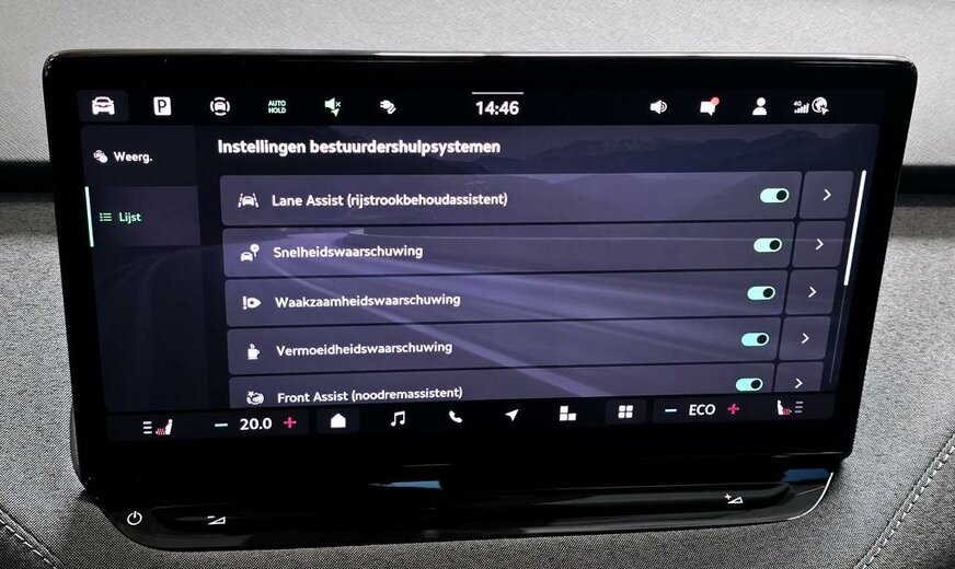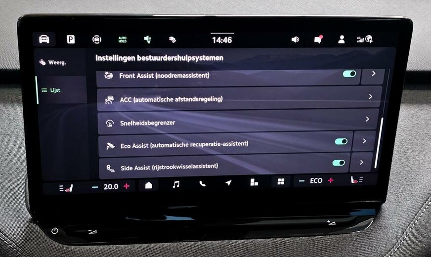 De veiligheid is gewaarborgd door zijdelingse airbags voor- en achteraan met hoofd- en interactie-airbag vooraan, Lane Assist met Traffic Jam Assist en Emergency Assist, Side Assist en Front Assist.