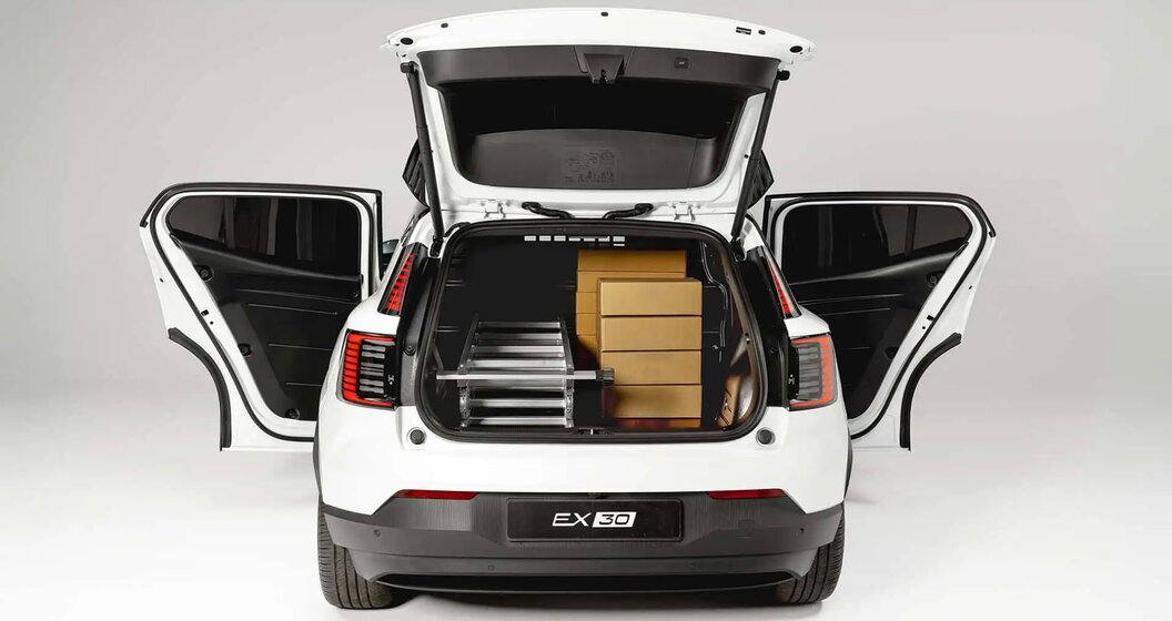 Van buiten is de ombouw nauwelijks zichtbaar. De EX30 Cargo behoudt zijn moderne uitstraling, met enkel getinte achterruiten en aangepaste toegang. Binnen is het echter een ander verhaal: de achterbank verdwijnt, de vloer wordt volledig vlak en het laadvolume groeit tot 1.000 liter. Ideaal voor professionals die imago en functionaliteit willen combineren, met een laadvermogen van 390 kg.