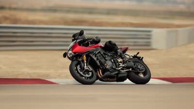 Dit is de Triumph Speed Triple RR in vol ornaat. De RR is de caféracerversie van de Speed Triple 1200 RS. Hij maakt gebruik van hetzelfde chassis en heeft een driecilindermotor van 1.160 cc die 180 pk bij 10.750 opm ontwikkelt.