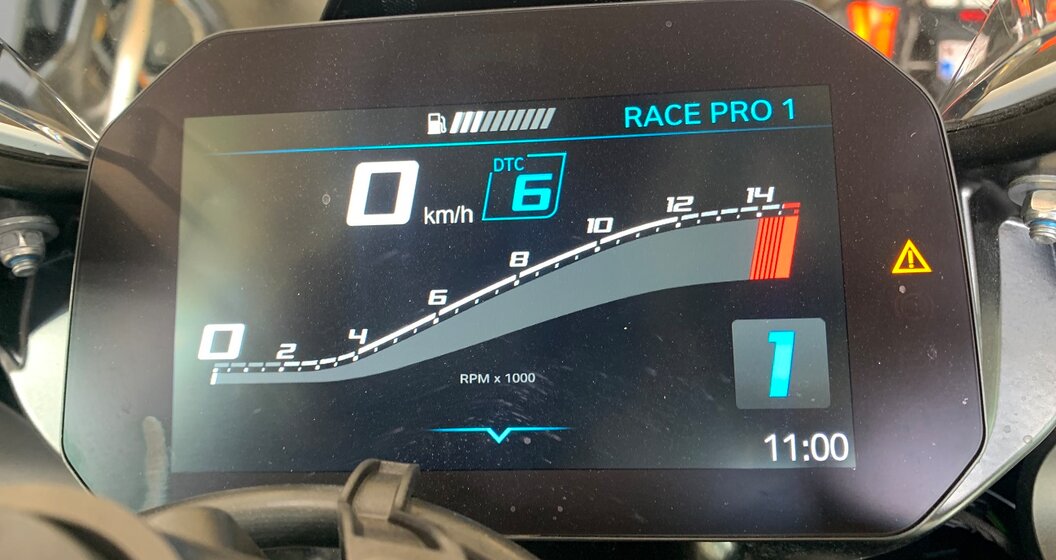 Het favoriete speelterrein voor dit type hypersportmotor, is uiteraard het racecircuit (hoewel ik ‘m al eerder in de stad heb geprobeerd, zie Moto Trends van mei). Dus maakte ik afgelopen juli gebruik van het Mertens School-parcours in Mettet, om de horde paarden te proberen begrijpen en te temmen, die zich achter het prachtige kuipwerk van deze machine schuilhouden. Met enige voorzichtigheid, probeerde ik de instellingen aan te passen om de tussenkomst van zowel de wheelie- als tractiecontrole te verhogen. Met de opties die BMW op deze motor heeft geschroefd, is deze S1000RR immers meer dan 26.000 euro waard. Ik heb geen zin om bij mijn bankier te lenen om eventuele schade te vergoeden die is veroorzaakt door te veel zelfvertrouwen of optimisme, ook al begrijpt BMW als een van de weinige fabrikanten de risico's die gepaard gaan met het testen van dergelijke machines. Aanvankelijk slaag ik er maar niet in om de instellingen naar m’n hand te zetten. Gelukkig had een van de andere cursisten een M1000RR en vinkte hij de Rain-modus uit, waardoor ik de Race-modus niet kon instellen. Dus ik kies voor de Pro Race 1-modus, die perfect bij me past voor deze dag.
