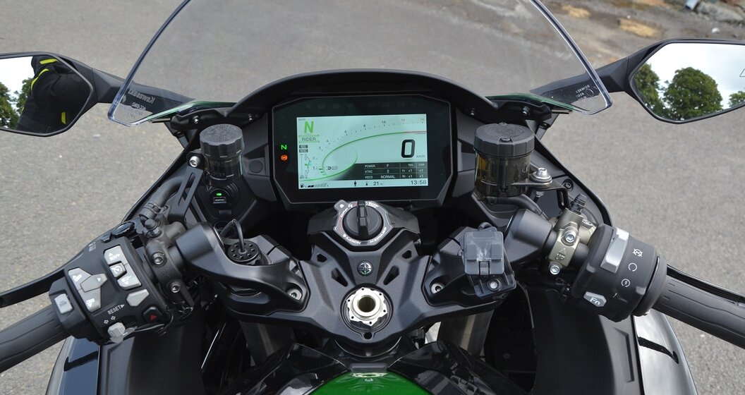 Dit jaar is de H2 SX SE licht geëvolueerd met de komst van een assistentiesysteem voor de verlichting dat automatisch overschakelt van dimlicht naar grootlicht. De uitrusting aan boord is copieus, met een ARAS-radarsysteem (Bosch) en adaptieve cruisecontrole, waarschuwing voor aanrijdingen en dode hoek, elektronische ophanging, een Brembo Stylema-remsysteem vooraan en een speciale livrei. Hoewel deze machine deel uitmaakt van het Sport Tourer-gamma van de Japanse fabrikant, voelt het meer alsof je op een supersport rijdt. Het windscherm staat vlak voor je neus en de zithouding, die gedicteerd wordt door de clip-ons, dwingt je naar voren te leunen. Met andere woorden: een zeer sportieve rijpositie. Misschien een beetje te sportief naar mijn smaak voor gebruik op de weg. Aan de andere kant is het zadel (835 mm) comfortabel en dwingen de voetsteunen je niet om je knieën te veel te buigen. Dat is alvast positief. De bediening verloopt vrij intuïtief en de rem- en koppelingshendels zijn verstelbaar. De bestuurder geniet ook van een royaal dashboard met een groot 6,5-inch TFT-scherm. Er is ook een 12V-sigarettenaansteker aan de linkerkant van het dashboard voorzien. Een USB A-poort is ook beschikbaar onder de duozit.