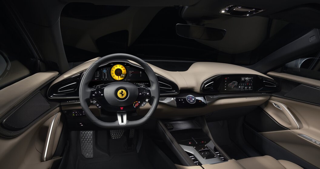 Om in de cabine te geraken, gaan de elektronisch gestuurde achterdeuren open met een erg leuk effect! Binnenin zijn er vier zitplaatsen en een bagageruimte van 473 liter. De achterpassagiers zitten bekwaam in hun individuele zetels en krijgen voldoende ruimte. Maar de beste plaatsen bevinden zich vooraan! De bestuurder krijgt met het typische digitale stuurwiel en de meters van Ferrari, terwijl de bijrijder recht heeft op een 10,2 duim groot scherm met alle functies van de auto. De airconditioning kan worden geregeld met een knop die van het dashboard kan worden gelicht.