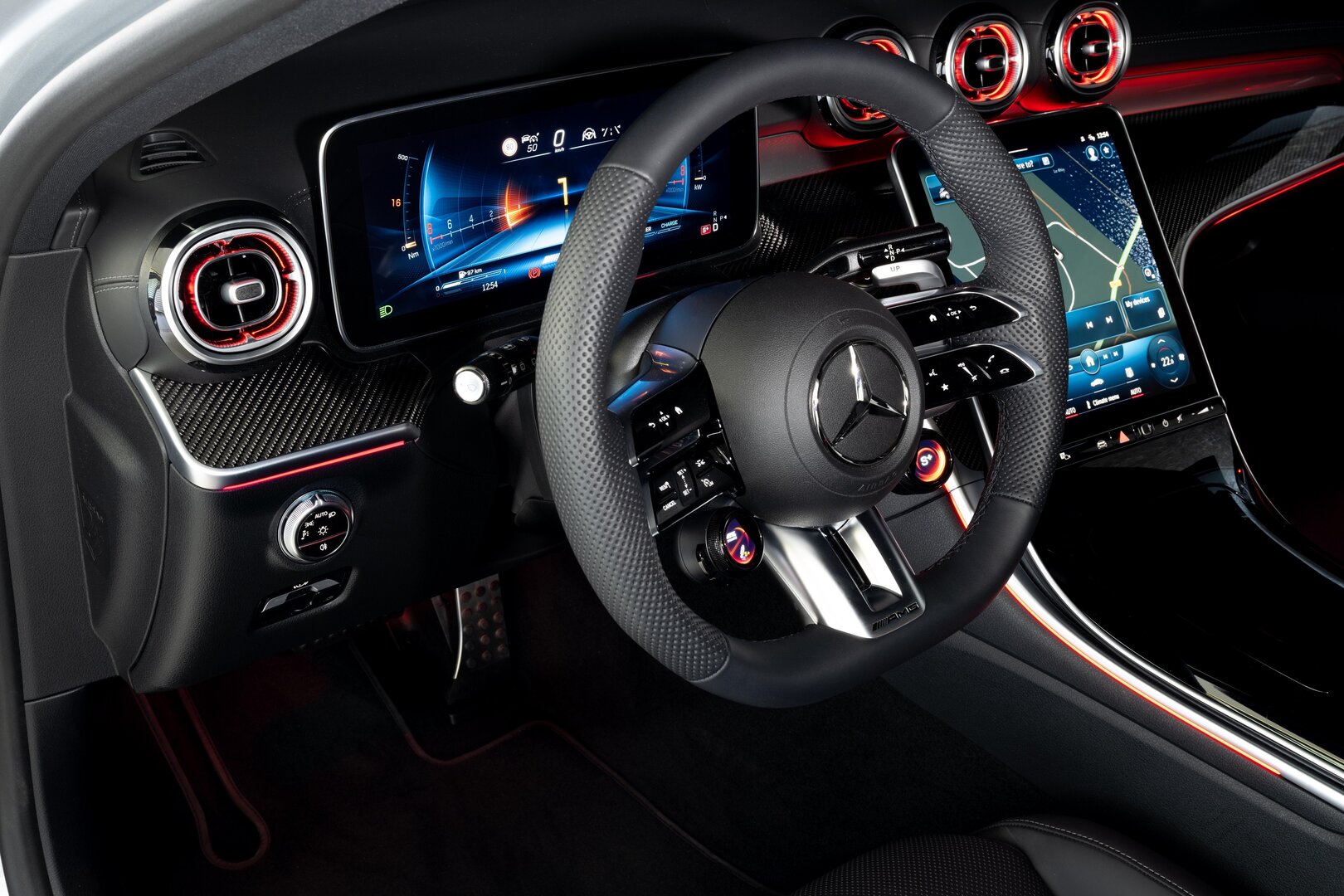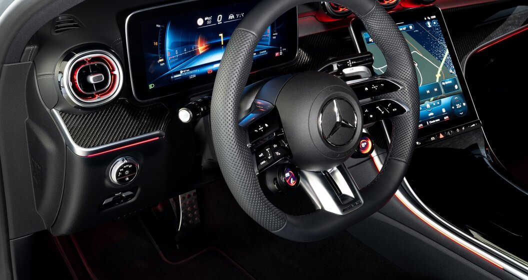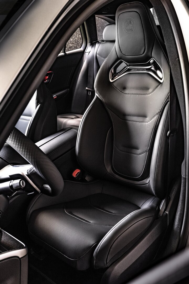 In het interieur wordt alcantara afgewisseld met koolstofvezelaccenten, aangevuld met goed ontworpen kuipstoelen. Ook het AMG-stuurwiel (vier spaken) met touchbediening is aanwezig, met aan de rechterkant twee draaiknoppen voor het selecteren van de gewenste rijmodus en aan de andere kant voor het instellen van de ophanging, de uitlaat en de automatische versnellingsbak (standaard).