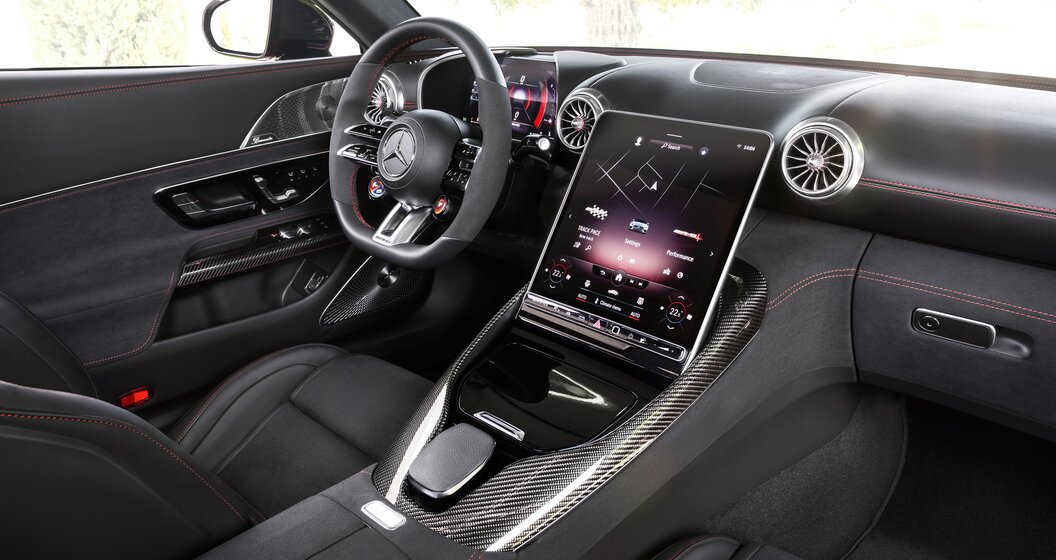 De SL keert dus terug naar zijn 2+2-configuratie, en vertrouwt op een klassieke canvaskap die in 15 seconden tot 50 km/u bediend kan worden. Het interieur is een toonbeeld van technologie op zich, met een indrukwekkend centraal scherm van 11,9 duim dat tussen 12 en 32 graden kan worden gekanteld voor een uitstekende leesbaarheid, zelfs in direct zonlicht. Het is geïntegreerd in een dashboard dat traditie, zoals de ronde verchroomde luchtroosters die Mercedes zo dierbaar zijn, combineert met een ultra moderne uitwerking.