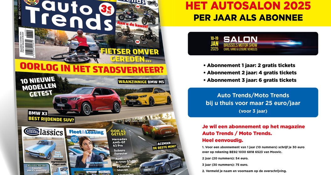 Auto Trends heeft namelijk besloten om 2 toegangstickets voor het Autosalon van Brussel te schenken bij elk jaarabonnement op het tijdschrift, wat neerkomt op 10 nummers. Abonneert u zich voor twee jaar? Dan krijgt u vier tickets. Voor drie jaar? Zes tickets. Bovendien zijn de abonnementsprijzen voordeliger: €30 voor een jaar, €54 voor twee jaar, of €75 voor drie jaar. Klik hier, volg de procedure en kom naar de Heizel om van het Autosalon van Brussel een toekomstig hoogtepunt in de autowereld te maken.