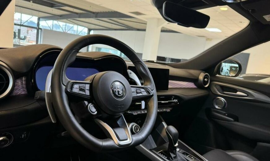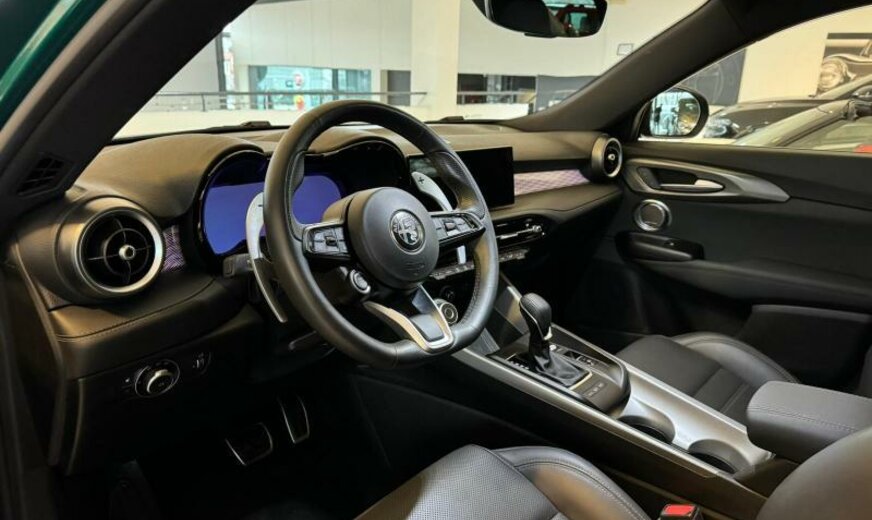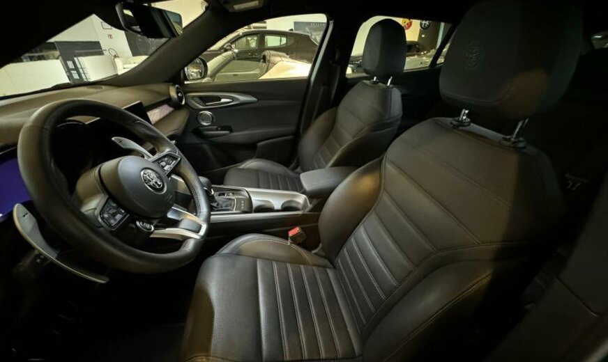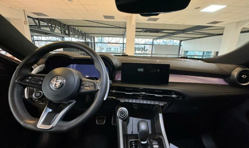modèle 2022, système \\\"AQS\\\", chauffage supplémentaire PTC , rétroviseurs réglables électrique et jour/nuit automatique, 2 connexions USB av, gicleurs lave-glace chauffants, enjoliveurs cadre vitre noir brillant, pédalier Sport en aluminium, conduite autonome de niveau 2, 1332 cc 1,3 L 132 KW essence / 206 KW Total , Alfa Connect System, Alfa Connect Services, AWD, suspension sport, 8 J x 19 Alu, protection moyeux noir et blanc, étriers de frein peints en rouge, 3 couches nacrée