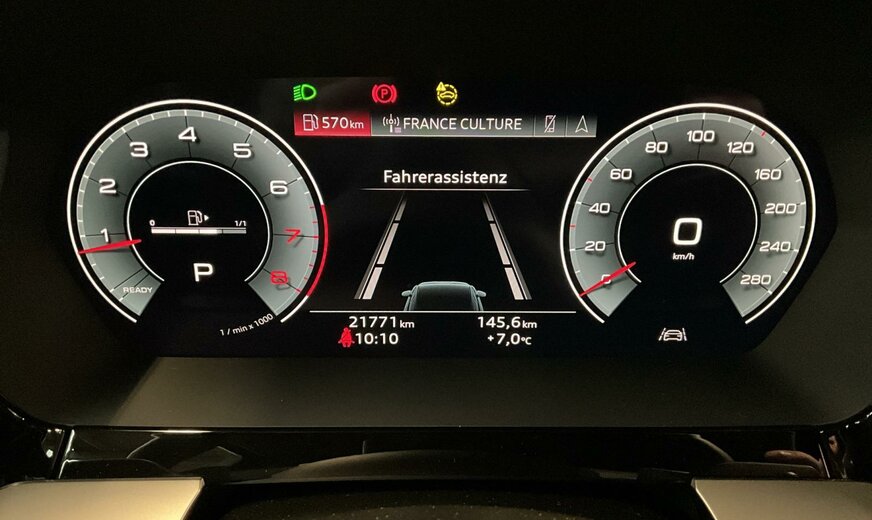 0E0E Noir Mythe Métallisé \r\nAC Noir-Noir/Noir-Noir/Noir/Gris Acier \r\nWKE Pack Business plus \r\nYEQ Code contrôle interne \r\n0VC Documentation de bord en allemand \r\n1JC Suspension sport \r\n1M5 Préparation pour dispositif d\\\'attelage \r\n1XX Volant en cuir à 3 branches avec multifonction plus et palettes de changement de vitesse \r\n3A5 Fixation de siège enfant ISOFIX à l\\\'avant, Top tether et i-Size pour les sièges arrière extérieurs \r\n3NT Dossier rabattable à l arrière en 3 parties avec accoudoir central 40/20/40 \r\n3V6 Régulateur de vitesse plus limiteur de vitesse. FOD : ACC possible \r\n4H5 Sécurité-enfants, commandée électriquement \r\n7X5 Assistant de stationnement avec aide au stationnement plus \r\n9AK Climatisation automatique confort à 2 zones \r\n9S9 Audi virtual cockpit plus 12,3\\\" \r\nC43 Permis d\\\'exploitation, modification \r\nIT4 Audi connect Navigation Infotainment \r\nIU1 Audi Smartphone Interface \r\nN4F Combinaison de cuir/similicuir mono.pur 550 \r\nQE1 Pack de rangement et de compartiment à bagages