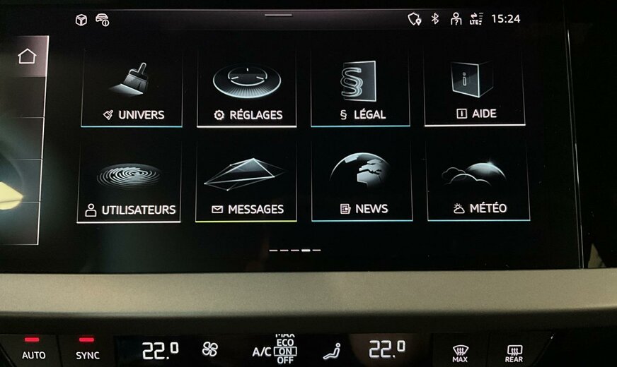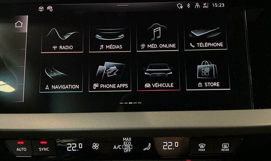 9W9WBleu Ascari métallisé\r\nAOnoir-noir-gris roche/noir-noir /noir/gris acier\r\nPWAIntérieur avec sièges normaux, combinaison cuir/simili cuir noir\r\nPYCPack de climatisation plus\r\nPYKPack d\\'assistance à la conduite et au stationnement plus\r\nWKEPack Business plus\r\n1JCSuspensions sport\r\n1Z1Augmentation du remplissage de carburant standard initial\r\n4G3Assistance aux embardées et assistance aux virages\r\n4GHVitrage calorifuge et acoustique pour pare-brise avec bande teintée Gris\r\n4UFAirbags frontaux, airbag passager avant désactivable\r\n6C2Airbags latéraux à l\\'avant avec système d\\'airbags rideaux et airbag central à l\\'avant\r\n6I5Avertissement de sortie de voie avec assistance d\\'urgence\r\n7K1Système de surveillance de la pression des pneus\r\n7UGMMI Navigation plus avec MMI touch\r\n8J3Audi pre sense avant\r\n98RPack Infodivertissement 1 uniquement pour Audi \r\n9S9Cockpit virtuel Audi Plus\r\n9VDSystème audio Audi\r\n9ZVCabine téléphonique Audi Lumière\r\nC9MRoues à 5 rayons en V, 8,0J x 17, pneus 225/45 R17\r\nFP1Préparation aux fonctionnalités à la demande\r\nIT3Audi connect Navigation et Infodivertissement Plus\r\nIU4Boutique d\\'applications Audi et interface pour smartphone\r\nIW3Appel d\\'urgence et service Audi connect avec télécommande et contrôle Audi connect\r\nNZ2Appel d\\'urgence juridique\r\nQK1Avec caméra multifonction\r\nQR9Reconnaissance des panneaux de signalisation par caméra\r\nQV3Diffusion audio numérique\r\n1M5Préparation de l\\'attelage de remorque\r\n3A5Ancrages pour siège enfant ISOFIX à l\\'avant, top tether et i-Size pour les sièges extérieurs arrière\r\n4H5Sécurité enfants à commande électrique\r\n5MJInsert décoratif en Aluminium Foncé