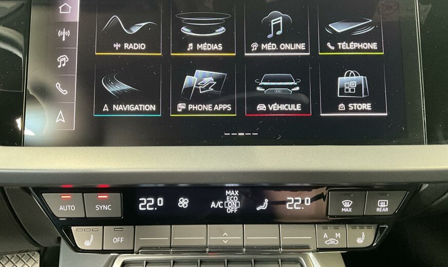 H1H1Gris manhattan métallisé\r\nAOnoir-noir-gris roche/noir-noir /noir/gris acier\r\nPWAIntérieur avec sièges normaux, combinaison cuir/simili cuir noir\r\nPYCPack de climatisation plus\r\nPYKPack d\\'assistance à la conduite et au stationnement plus\r\nWKEPack Business plus\r\nYEQCode contrôle interne\r\nJ4JBatterie 380 A 59 Ah EFB+\r\n0LZAvec plaques/autocollants/certificats de sécurité spéciaux pour le Luxembourg\r\n0SSAutocollants/plaques, anglais-franais\r\n0VCManuel en allemand\r\n1EXPlaque du constructeur spéciale pour l\\'UE\r\n41RRoues, style 5 branches, 8,0J x 17, pneus 225/45 R17\r\n4G3Assistance aux embardées et assistance aux virages\r\n4GHVitrage calorifuge et acoustique pour pare-brise avec bande teintée Gris\r\n4UFAirbags frontaux, airbag passager avant désactivable\r\n4VNNorme d\\'émission, WLTP3 M1, N1-I//EU6EB\r\n6C2Airbags latéraux à l\\'avant avec système d\\'airbags rideaux et airbag central à l\\'avant\r\n6I5Avertissement de sortie de voie avec assistance d\\'urgence\r\n7K1Système de surveillance de la pression des pneus\r\n7UGMMI Navigation plus avec MMI touch\r\n8J3Audi pre sense avant\r\n98RPack Infodivertissement 1 uniquement pour Audi \r\n9S9Cockpit virtuel Audi Plus\r\n9VDSystème audio Audi\r\n9ZVAudi phone box light\r\nB32Pays d\\'homologation Luxembourg\r\nFP1Préparation aux fonctionnalités à la demande\r\nH8VPneus 225/45 R17 91Y\r\nIT3Audi connect Navigation et Infodivertissement Plus\r\nIU4Boutique d\\'applications Audi et interface pour smartphone\r\nIW3Appel d\\'urgence et service Audi connect avec télécommande et contrôle Audi connect\r\nJE3Module de données pour l\\'Europe\r\nNI7Code contrôle SWIN\r\nNZ2Appel d\\'urgence juridique\r\nQK1Avec caméra multifonction\r\nQR9Reconnaissance des panneaux de signalisation par caméra\r\nQV3Diffusion audio numérique\r\n0YDPlage de poids 4 seulement numéro de contrôle pour pose pas de prévision des besoins\r\n3A5Ancrages pour siège enfant ISOFIX à l\\'avant, top tether et i-Size pour les sièges extérieurs arrière\r\n4H5Sécurité enfants à commande électrique\r\n5MJInsert décoratif en Aluminium Foncé \\Spektrum\\\r\n7X5Aide au stationnement avec aide au stationnement Plus\r\n8T3Régulateur de vitesse adaptatif sans limiteur de vitesse\r\nC56Autorisation de circulation, supplément\r\nL08Plage de suspension 08 seulement numéro de contrôle pour pose pas de prévision des besoins\r\nQL5Verre réfléchissant la chaleur teinté foncé