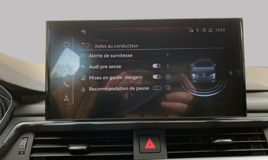 réservoir carburant 54 L, pack brillance, rétroviseur g avec miroir asphérique, rétroviseur d convexe, triangle de secours dans le couvercle ar, radio avec récepteur numérique, garnissage Index, dossiers ar séparés, système d\\\'information conducteur avec écran couleur, liquide de refroidissement R1234YF, alternateur renforcé 130/200 A, 1984 cc 2,0 L 110 KW, freins ar 300x12, JANTES 7 J X 16 ALU, Audi Drive Select, roues av motrices traction , 205/60 R 16 .. H, roue de secours temporaire, protection des piétons, transmission hybride M-HEV, norme anti-pollution Euro 6 AP, grille de calandre sans plaque immat, caméra frontale pour assistant à la conduite, freins av 314x25, 2 couches nacrée