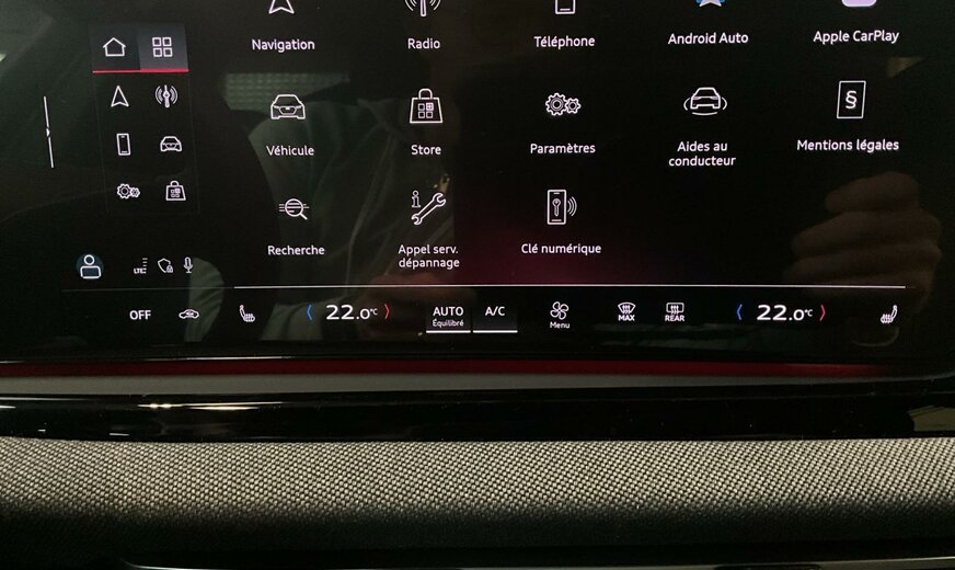 Z7Z7 Gris Chronos Métallisé \r\nOI Noir-Noir-Beige Cardamome/Noir-Noir/ Noir/Noir \r\nPQ2 Tech plus \r\nPWK Intérieur S line avec sièges sport, tissu en Noir \r\nWDQ Pack Business plus \r\n2F1 Clé mobile \r\n4K5 Clé confort sans SAFELOCK \r\n4L6 Rétroviseur intérieur à réglage jour/nuit automatique \r\n5MV Inserts décoratifs en aluminium mat brossé avec marquage linéaire Anthracite \r\n5P2 Détection des occupants à l\\\'arrière \r\n6I5 Alerte de sortie de voie avec pilotage semi-automatique du véhicule en cas d\\\'urgence médicale \r\n79H Assist. de changement de voie et avert. d\\\'ouv. de porte, assist. de cir.transv. arrière et assistant de braquage arrière \r\n98R MMI experience plus \r\n9VD Audi sound system \r\n9ZE Audi phone box \r\nC1Q Jantes, style \\\"Aero\\\" à 5 bras, Noir, tournées brillantes, 8,0J x 18, pneus 235/45 R18 \r\nFT1 Assistant aux manoeuvres de stationnement Plus \r\nGB1 Soutien LTE pour Audi phone box \r\nIU6 Audi Application Store et interface de smartphone \r\nQL5 Vitrage pare-soleil surteinté \r\nQQ2 Pack Éclairage d\\\'ambiance Plus