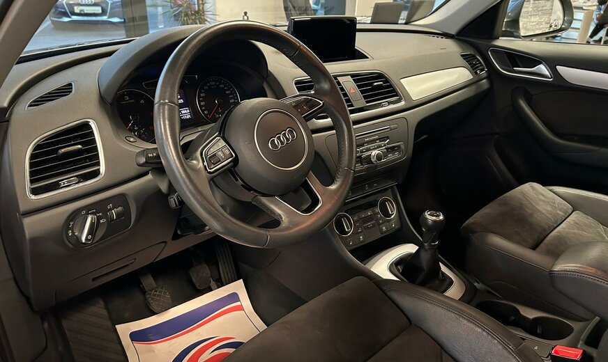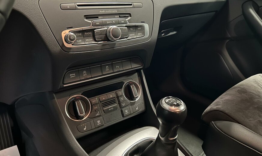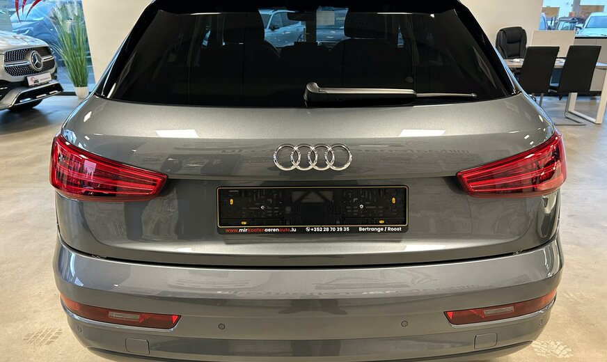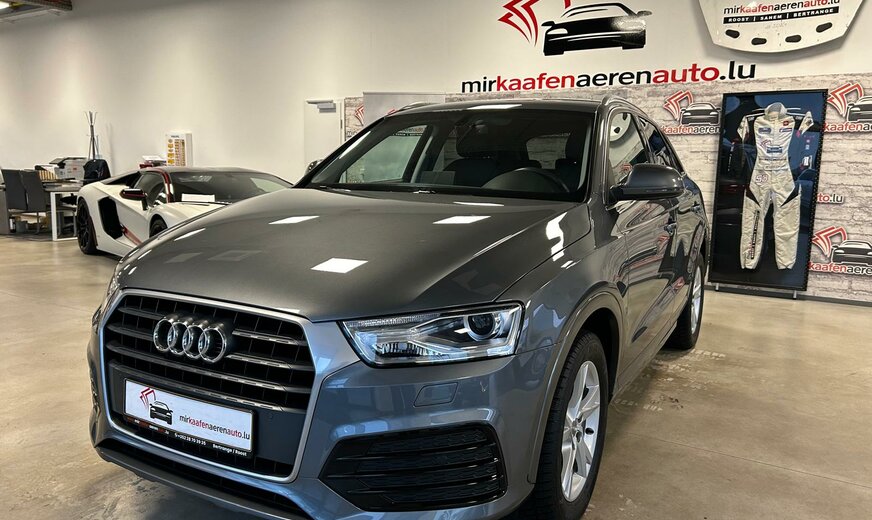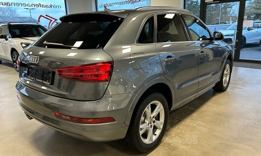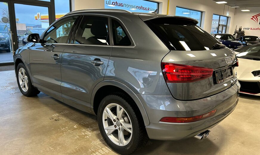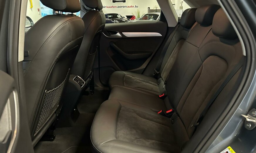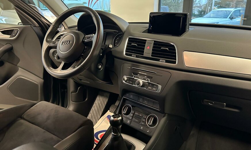 Audi Q3 Sonderausstattung: Ablage- und Gepäckraum-Paket, Audi music interface, AuÃenspiegel elektr. verstell-, heiz- und anklappbar, Dachhimmel Stoff, schwarz, Einparkhilfe vorn und hinten, optisch (APS Plus), Fahrassistenz-System: Anfahr-Assistent (hold assist), Gepäckraumklappe elektr. betätigt (öffnen + schliessen), Heckleuchten LED, Innenspiegel mit Abblendautomatik, Komfort-Klimaautomatik 2-Zonen, Lenkrad (Sport/Leder - 3-Speichen) mit Multifunktion, Metallic-Lackierung, Modellvariante CO2-optimiert (Ausführung e, Ultra), Multi-Media-Interface MMI Basic / MMI Radio, Navigations-Paket, Sitzbezug / Polsterung: Alcantara/Leder, Sitzheizung vorn, Universal-Schnittstelle Bluetooth, Verglasung hinten abgedunkelt (Privacyverglasung), Wendeladeboden (Ladeboden) Weitere Ausstattung: Airbag Fahrer-/Beifahrerseite, Antriebs-Schlupfregelung (ASR), Audi Drive Select, AuÃenspiegel asphärisch, links, AuÃenspiegel asphärisch, rechts, AuÃenspiegel Wagenfarbe, Blinkleuchten LED in AuÃenspiegel integriert, Bremsanlage mit Rekuperationssystem, Bremsassistent, Dachreling (Aluminium), Dynamik-Fahrwerk, Elektron. Differentialsperre (EDS), Fahrassistenz-System: Berganfahr-Assistent, Fahrer-Informations-System (FIS), Fensterheber elektrisch vorn + hinten, Glanz-Paket, Innenausstattung: Aluminium-Optik, Innenausstattung: Dekoreinlagen Mikrometallic, Isofix-Aufnahmen für Kindersitz, Karosserie: 4-türig, Kopf-Airbag-System (Sideguard), Lenksäule (Lenkrad) mech. Höhen-/Längsverstellung, LM-Felgen, Motor 2,0 Ltr. - 110 kW 16V TDI, Radstand 2603 mm, Rücksitzlehne geteilt/klappbar, Schadstoffarm nach Abgasnorm Euro 6, Scheibenwaschdüsen heizbar, SCR-System (AdBlue-Technologie), Seitenairbag vorn, Sportsitze vorn, Start/Stop-Anlage, Voll-Lackierung, Xenon-Scheinwerfer Plus (Abblend- und Fernlicht)