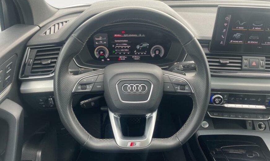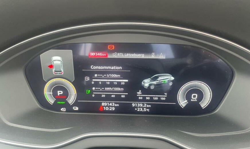 radio avec récepteur numérique, galerie de pavillon noire, 255/40 R 21 ..Y, FREINS AV 350X34, FREINS AR 330X22, pare-soleil portes ar à enrouleur, caméra av, Audi Phone Box, système lave-phares, câble de charge pour prise domestique Type E/F DT/FR , câble de charge pour prise industrielle CEE 16 A/400 V/6 h long + droit, caméras périphériques, pack S-Line Exterieur, pack optique noir, glace du rétroviseur g asphérique, glace du rétroviseur d asphérique, filet de séparation, 1984 cc 2,0 L 195 KW essence /220 KW Total , liquide de refroidissement R1234YF, AWD, prise de charge AC Type 2 Mode 2-3 EU , câble de charge Mode 3 Type 2 3P 32A, JANTES 8,5J X 21 ALU, encarts décoratifs en aluminium brossé, enjoliveurs bas de caisse/protection du seuil de chargement inox, protection des piétons, appuis lombaires av réglables électrique, systèmes de sécurité étendu Pre Sense Basic/Pre Sense Rear , ceintures de sécurité avec contact électrique dans la boucle, transmission hybride PHEV, 2 couches nacrée