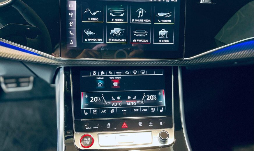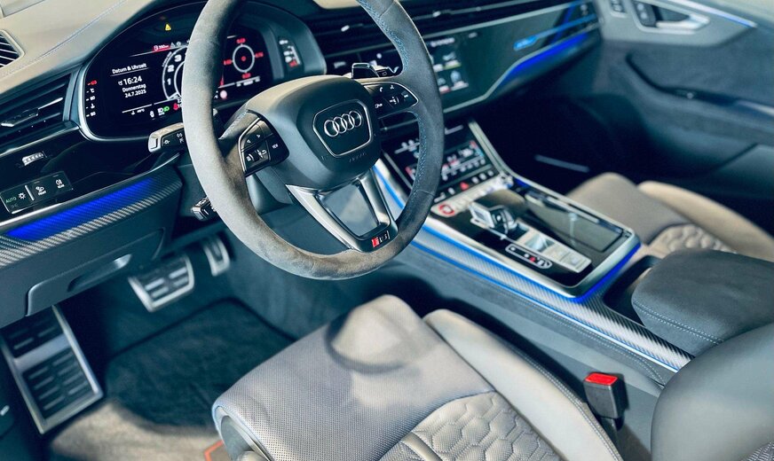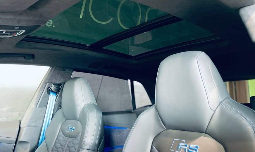 RS Blue Design Plus Package, Black Optic Package Plus, Carbon Matt Interior Decorative Inserts, Advanced Suspension Package, Ãchappement Sport RS, RS Ceramic Brake System, Assistance Plus Package avec Parking Assistant Plus, Parking Heater & Ventilation, VMax 305 km/h, Suspension Pneumatique, Door Soft Close, Home Link, Distance Warning, Lane Departure Warning, Audi Pre Sense avec Turn-Off Assist & Swerve Assist, Side Assist, Traffic Sign Speed Warning, Fatigue Warning, Distraction Warning, Trailer Recognition, Traffic Light Information, Background Lighting, Audi Drive Select, Auto Start & Stop, Keyless-Go avec Audi Connect Key, Galerie de toit avec Barres de toit, Toit ouvrant panoramique avec store électrique, Stores électriques portes arrière, Attache-remorque électrique, Hayon électrique Open & Close, Trappe à ski, Park Assist, Parktronic avant et arrière avec caméra 360° incl. Manoeuvre Assist & Rear Cross-Traffic Assist, HD Matrix LED & Audi Laser Light avec Digital Light Signatures, High Beam Assist, Capteur de pluie, Rétroviseurs électriques rabattables, Sièges Sport RS électriques à mémoire en cuir chauffants et ventilés avec fonction massages, Sièges arrière chauffants, Head-Up Display, Audi Virtual Cockpit avec RS-Layout, Volant multifonctions en alcantara à réglage électrique et chauffant, Palettes au volant, Adaptive Cruise Control avec Travel Assist, Bluetooth, Navigation, Online Media, Phone Apps, Phone Box, Radio touch DAB / DVD / USB-C / BT audio / WLan, Bang & Olufsen Advanced 3D Sound System, Isofix+