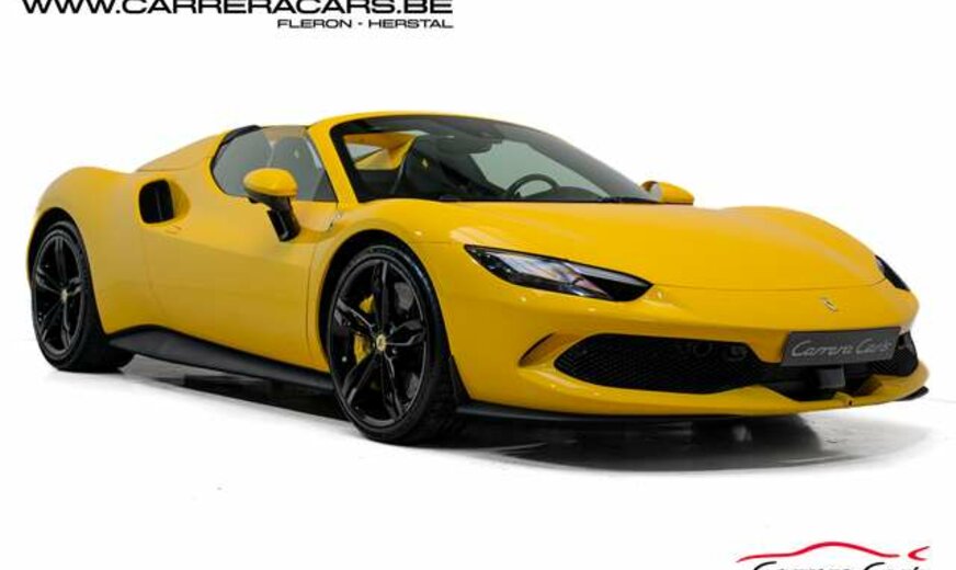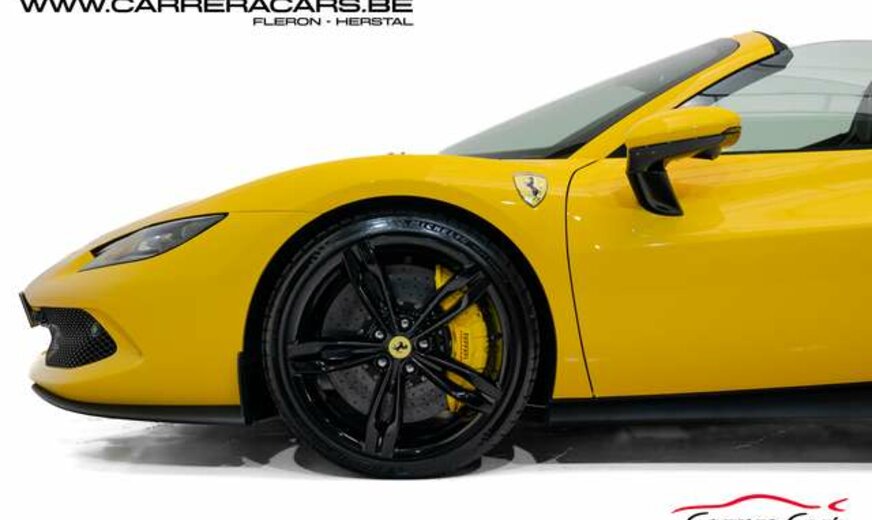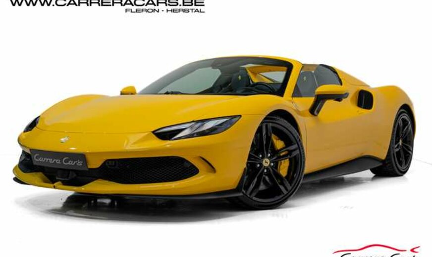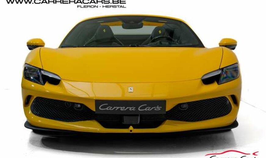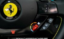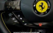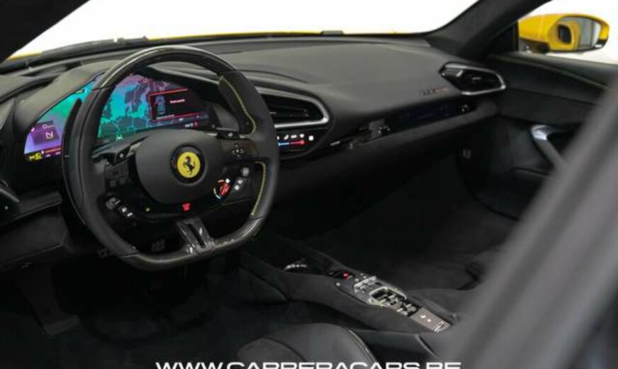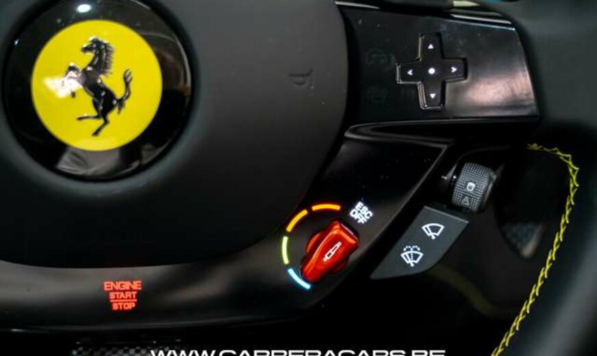 * Equipements (FR) : Couleur Giallo Triplo Strato, Suspension lift, Sièges sport Daytona Carbone & alcantara, Rehausse de siège sportive, Cheval Ferrari brodé sur les appuie-têtes, Volant carbone avec LED, Système Hi-Fi Premium JBL, Caméras 360°, Navigation, Apple CarPlay, Affichage tête haute, Chargeur smartphone sans fil, Sorties d’échappement en céramique noire, Rétroviseur électrochromique, Capteurs de stationnement avant et arrière, Regulateur de vitesse adaptatif, Limiteur de vitesse, Lane assist, Phares au LED avec système AFS, Frein à main électrique, Etriers de frein jaunes, Climatisation, Direction Assistée, MyFerrari Connect, etc..