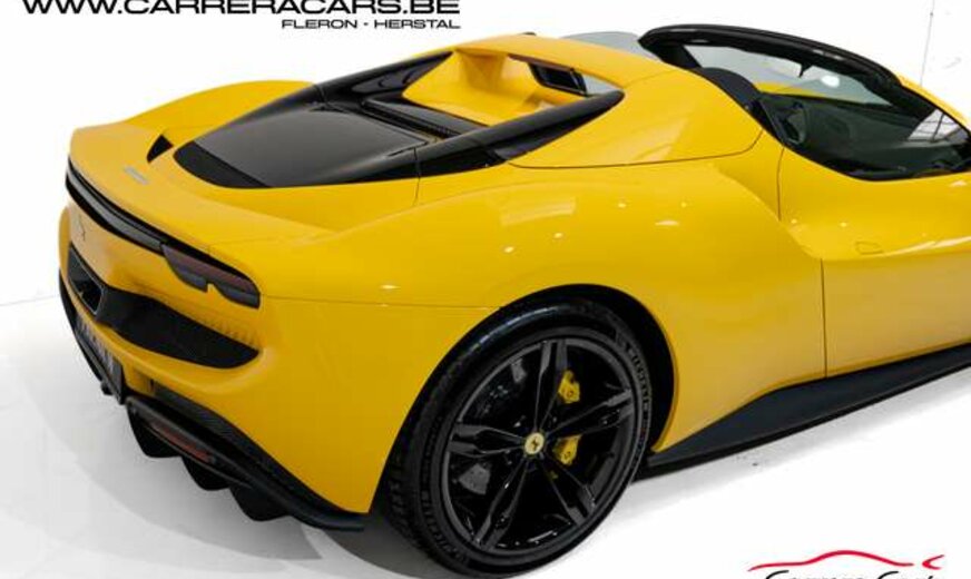 * Equipements (FR) : Couleur Giallo Triplo Strato, Suspension lift, Sièges sport Daytona Carbone & alcantara, Rehausse de siège sportive, Cheval Ferrari brodé sur les appuie-têtes, Volant carbone avec LED, Système Hi-Fi Premium JBL, Caméras 360°, Navigation, Apple CarPlay, Affichage tête haute, Chargeur smartphone sans fil, Sorties d’échappement en céramique noire, Rétroviseur électrochromique, Capteurs de stationnement avant et arrière, Regulateur de vitesse adaptatif, Limiteur de vitesse, Lane assist, Phares au LED avec système AFS, Frein à main électrique, Etriers de frein jaunes, Climatisation, Direction Assistée, MyFerrari Connect, etc..