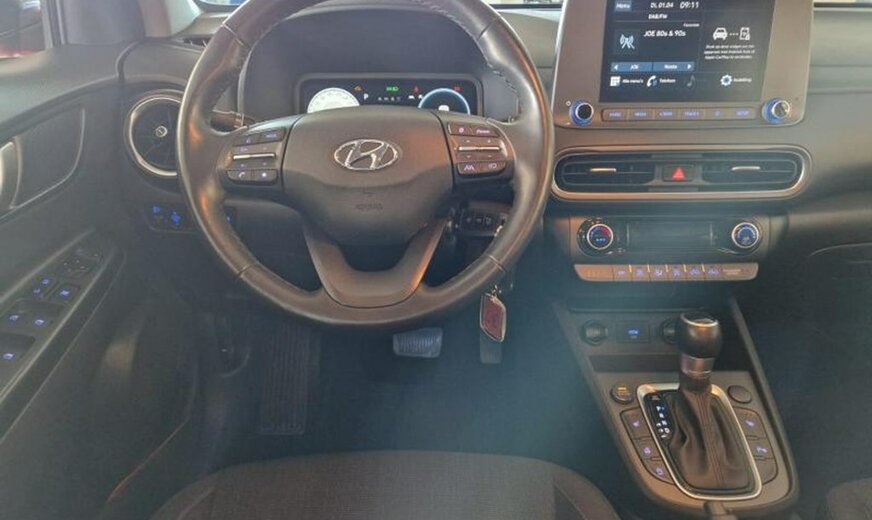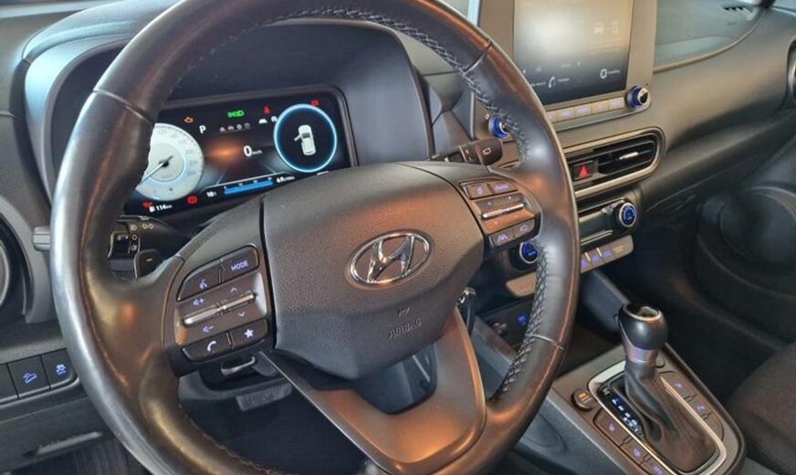 Deze Kona staat hier in een zeer complete uitvoering in automaat en heeft de 1.0 T-GDi benzinemotor met een vermogen van 120pk!