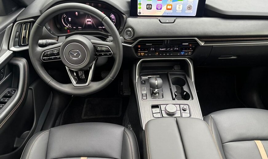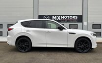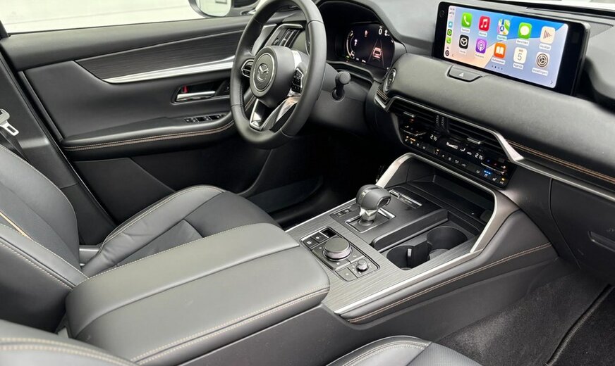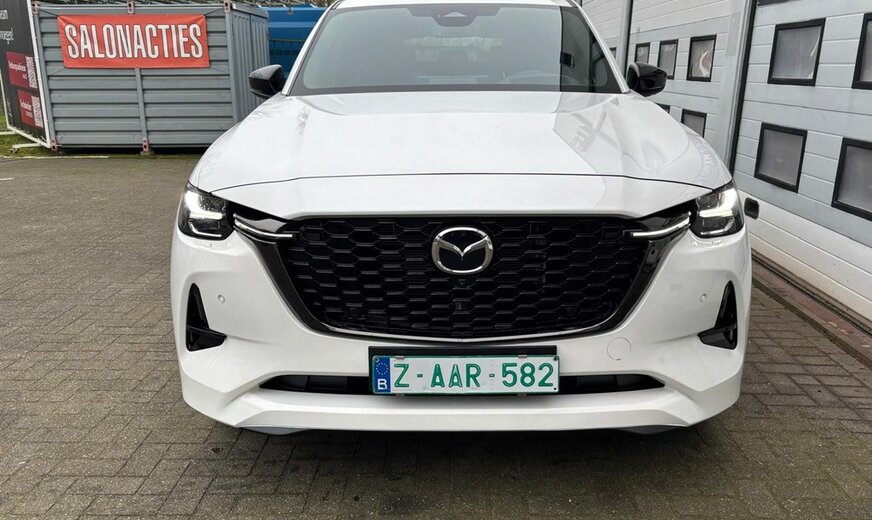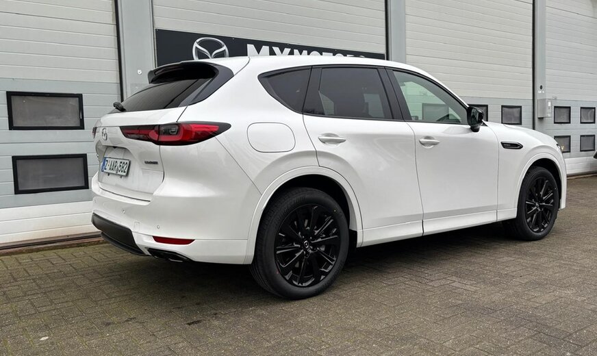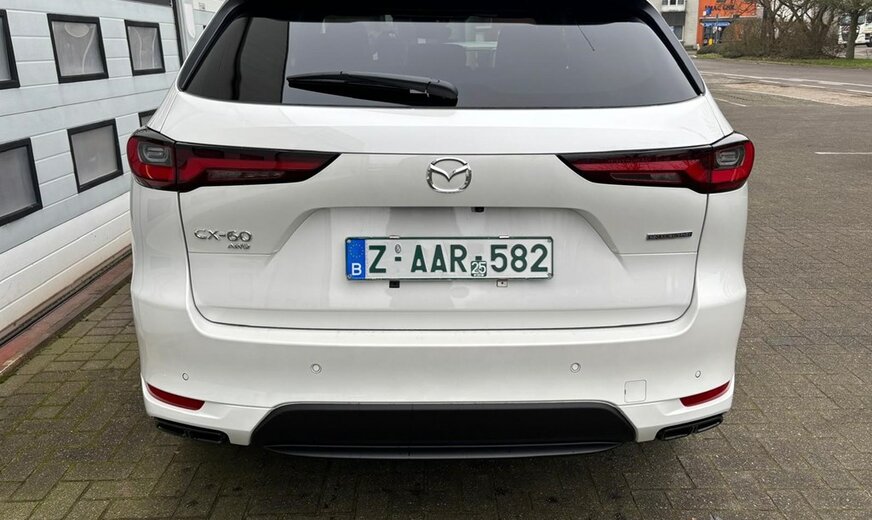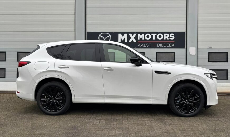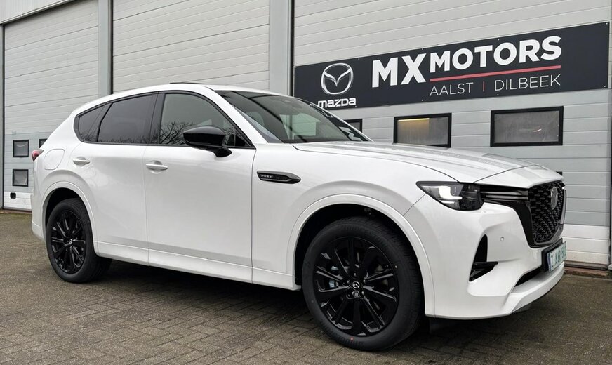 Directiewagen MAZDA CX-60 2.5L e-SKYACTIV PHEV Plug-In Hybrid met 327pk 8AT AWD HOMURA PLUS in Rodium White met zwart nappa lederen interieur.