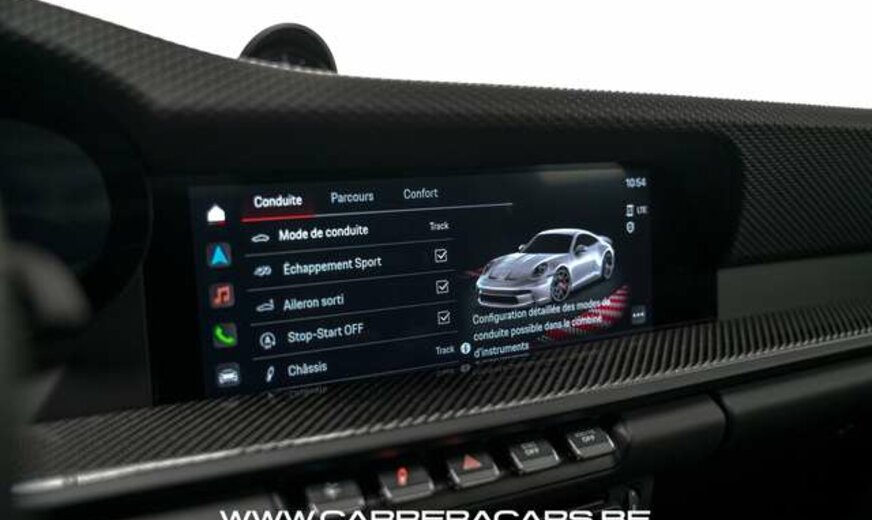 Sièges Sport Plus adaptatifs (18 positions, électriques) (Q1J), Boîte de vitesses Porsche Doppelkupplung (PDK) 7 rapports (G1C), Système de levage de l’essieu avant (lift) (2UH), Pack Sport Chrono (8LH), Réservoir de carburant de 90 litres (0I2), Jantes 911 GT3 20/21 pouces (C2Q), Phares matriciels à LED teintés avec Porsche Dynamic Light System Plus (PDLS +), Porsche Exclusive Manufaktur (8JU), Assistance parking avant et arrière avec caméra de recul (KA2), Affichage des panneaux de signalisation (QR9),Pack luminosité (QQ2), Sièges chauffants (4A3), Pack rangement (QE1), Ceintures de sécurité Rouge Racing Porsche Exclusive Manufaktur (FZ4),Ciel de toit et montants latéraux en Race- Tex (6NN)