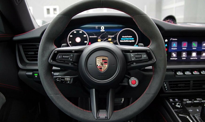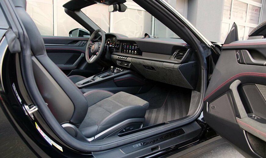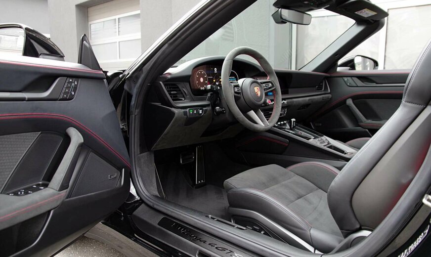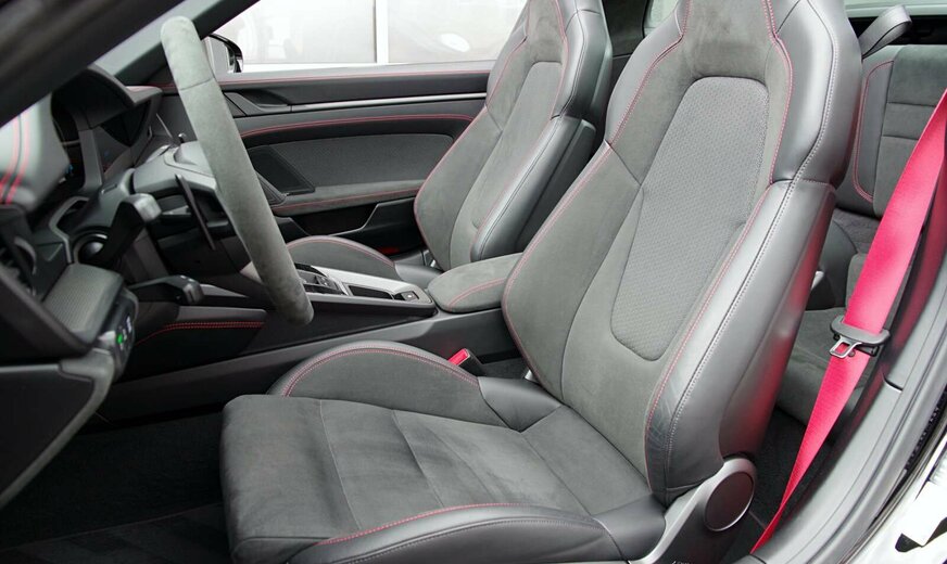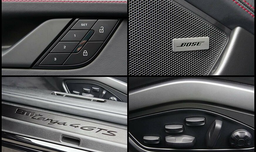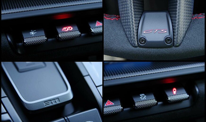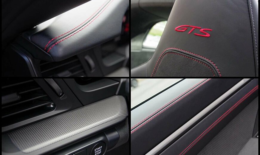 - Interieur-Paket GTS in Karminrot (Nähte in Kontrastfarbe, Sicherheitsgurte in Kontrastfarbe, âGTSâ Schriftzug in Kontrastfarbe auf Kopfstützen gestickt, inkl. FuÃmatten schwarz eingefasst mit Naht und âPORSCHEâ Schriftzug in Kontrastfarbe. Zifferblatt digitaler Drehzahlmesser und Sport Chrono Stoppuhr in Kontrastfarbe. Zierblenden Lenkradblende, Schalttafel, Türtafel und Mittelkonsole mit Carbon verkleidet)