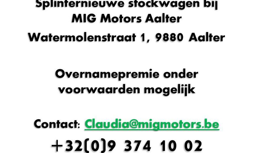 Splinternieuwe stockwagen bij MIG Motors Aalter: Watermolenstraat 1, 9880 Aalter. €39.959,00 incl. BTW. Extra vernamepremiekorting onder voorwaarden mogelijk. Contacteer claudia@migmotors.be of +32(0)9 374 10 02