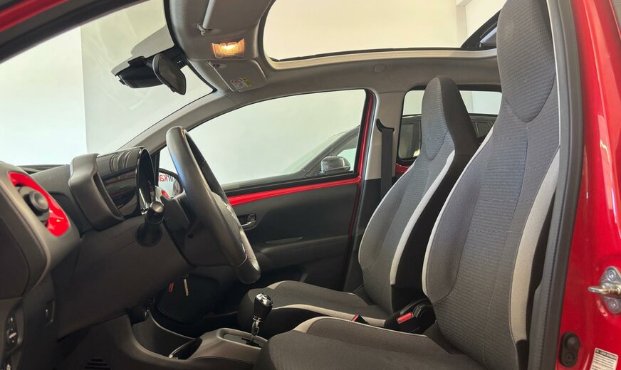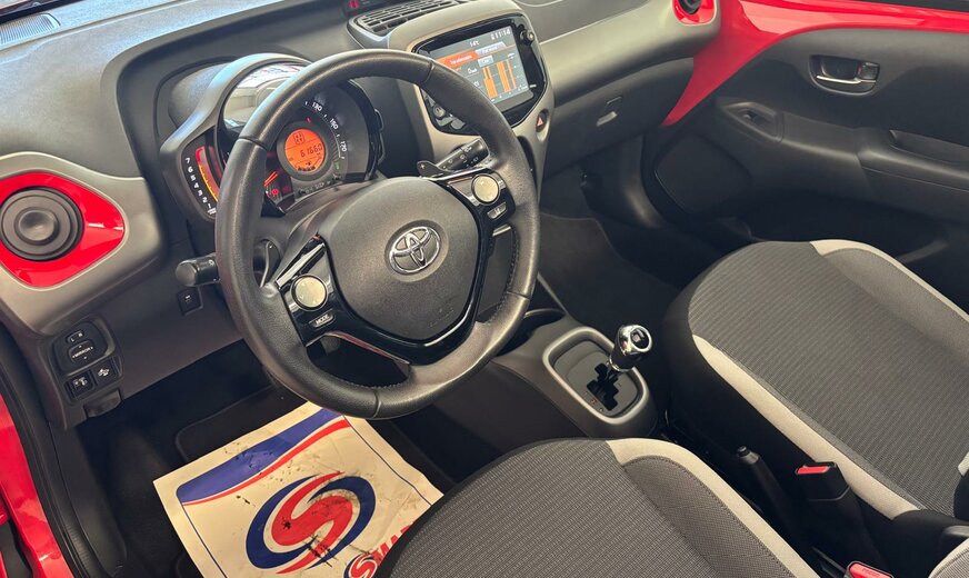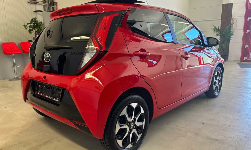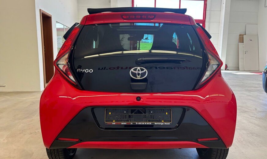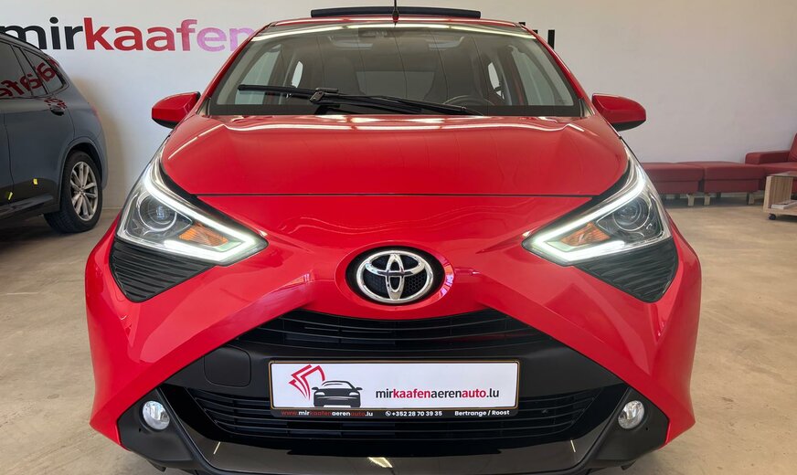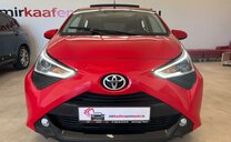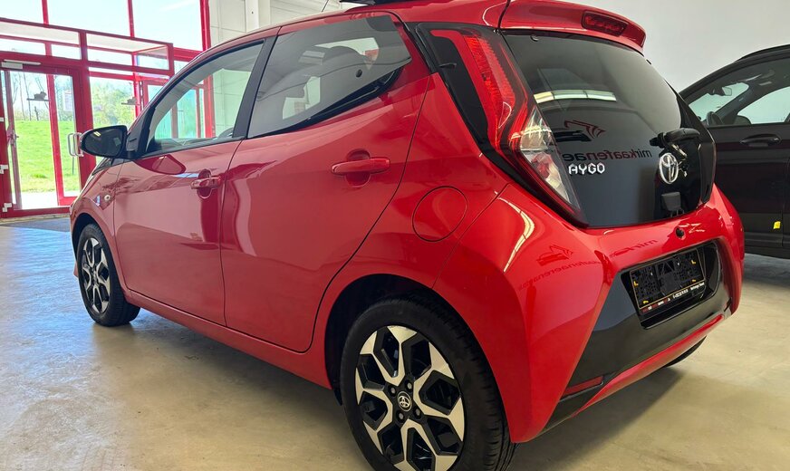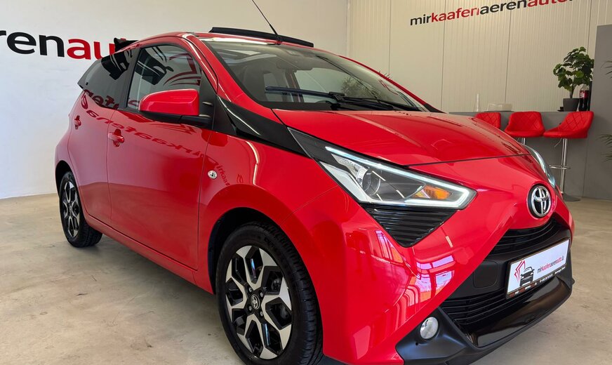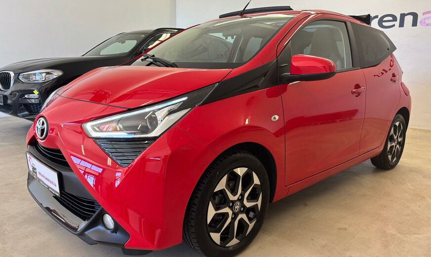 Toyota Aygo Sonderausstattung: Sonderlackierung Vulcano-Rot Weitere Ausstattung: 3. Bremsleuchte, Airbag Beifahrerseite abschaltbar, Airbag Fahrer-/Beifahrerseite, Audiobedienung am Lenkrad, Audiosystem: Radio, Außenspiegel elektr. verstell- und heizbar, Außenspiegel lackiert, Außentemperaturanzeige, Bordcomputer, Bremsassistent, Drehzahlmesser, Elektr. Bremskraftverteilung, Fahrassistenz-System: Berganfahrkontrolle (HAC), Frontgrill X-Element, Pianolack, Frontgrill X-Verlängerung, mattschwarz, Gepäckraumabdeckung / Rollo, Heckscheibe heizbar, Heckscheibenwischer, Heckschürze, schwarz matt, Innenausstattung: Anthrazit, Isofix-Aufnahmen für Kindersitz, Karosserie: 5-türig, Kopf-Airbag-System, Lenksäule (Lenkrad) höhenverstellbar, Modellpflege, Motor 1,0 Ltr. - 53 kW KAT, Reifen-Reparaturkit, Reifendruck-Kontrollsystem, Rücksitz geteilt, Rücksitz klappbar, Schadstoffarm nach Abgasnorm Euro 5, Schadstoffarm nach Abgasnorm Euro 6d-TEMP, Schalt-/Wählhebelgriff Leder, Seitenairbag vorn, Service-System: MyT-Connected Services, Sitz vorn links höhenverstellbar, Steckdose (12V-Anschluß) in Mittelkonsole, Stoßfänger Wagenfarbe, Türgriffe außen Wagenfarbe, Türgriffe innen verchromt, Warnanlage für Sicherheitsgurte hinten, Warnanlage für Sicherheitsgurte vorn, Wärmeschutzverglasung getönt, X-business-Paket