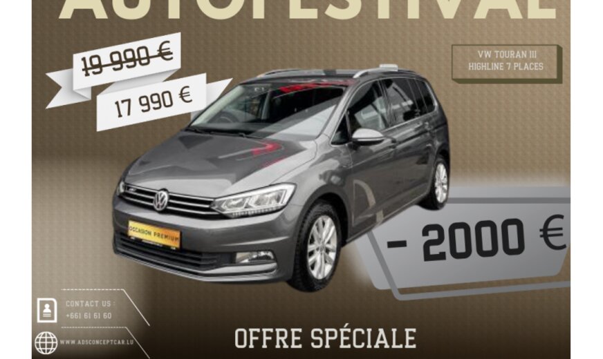 BIENVENUE CHEZ ADS CONCEPT CAR\r\n\r\nINFORMATIONS GÃNÃRALES\r\nMarque: Volkswagen\r\nModèle: Touran 2.0L 150CV\r\nType: III Highline 7 places \r\nForme de carrosserie: Monospace\r\nAnnée du modèle: 2017\r\n\r\nGARANTIE \r\nADS CONCEPT CAR\r\n12 mois\r\n\r\nRETROUVER CE VÃHICULE SUR NOTRE PARC A FOETZ:\r\n4 Rue de l\\'Avenir L-3895 foetz \r\nLuxembourg\r\n\r\n\r\nNous proposons également des SOLUTIONS DE FINANCEMENT sur place, étudiées et adaptées à votre situation, afin de faciliter l\\'acquisition de votre futur voiture\r\n\r\nProfitez dâune estimation de reprise sur mesure, sans engagement, et réservez un essai personnalisé du véhicule dâoccasion qui retient votre attention.\r\nNos conseillers se tiennent à votre disposition â en ligne, par téléphone ou en showroom â pour vous accompagner à chaque étape.\r\n\r\nLes équipements indiqués ont été recensés avec attention. Cependant, certains éléments peuvent varier ou ne pas apparaître dans cette descrlption.\r\nNous vous recommandons donc de vérifier les équipements qui comptent le plus pour vous avant de confirmer votre achat.\r\nCette présentation est fournie à titre informatif.\r\n\r\n\r\nLISTES DES OPTIONS :\r\n Aide au stationnement avant\r\n Aide au stationnement arrière\r\n Climatisation automatique\r\n Banquette arrière rabattable\r\n Crochet de remorquage\r\n Jantes en alliage\r\n Lève-vitres arrière électrique\r\n Lève-vitres avant électrique\r\n 7 places\r\n Phares antibrouillards\r\n Régulateur de vitesse\r\n Rétroviseurs électriques\r\n Sièges AV à réglage électrique\r\n Sièges avant chauffants\r\n Système multimédia\r\n Jantes 16\\\r\n Senseurs pluie\r\n Senseurs lumière\r\n Bluetooth\r\n Pare-brise chauffant\r\n Phares LED\r\n Park Assist\r\n Volant multifonctions\r\n USB\r\n Accoudoir\r\n Start/Stop automatique\r\n Volant en cuir\r\n Rétroviseur intérieur anti-éblouissement autom.\r\n Isofix\r\n Assistant feux de route\r\n Ãclairage d\\'ambiance\r\n Frein de stationnement électronique\r\n Vitres teintées\r\n SOUS RÃSERVE D\\'ERREURS \r\n\r\nN\\'hésitez pas à nous contacter pour toute question sur nos véhicules :\r\n\r\n+352 661 61 61 60 \r\n+352 621 484 350\r\n www.adsconceptcar.lu\r\n\r\nADS CONCEPT CAR